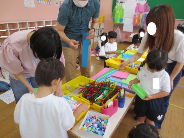 子ども達が描いた図面をみながら、カラーポリ袋がかわいい・カッコいい洋服に変身しました💕ファッションショーをしたり、最後に目をつぶってもらって、背中に隠した内緒内緒のプレゼントを渡して、ギューッとしてもらったみんなの笑顔が…