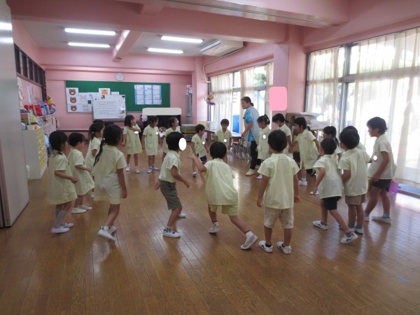 梅雨の時期に♫あめふりくまのこ♫を歌ったり、曲にあわせて動いたりしています。 藤組さんでは色とりどりの輪を使って「ドレミファソの音階」を入れながら、テンポ・リズムに合わせて歩いたり、音が止まったら走って戻ったり、少し難し…