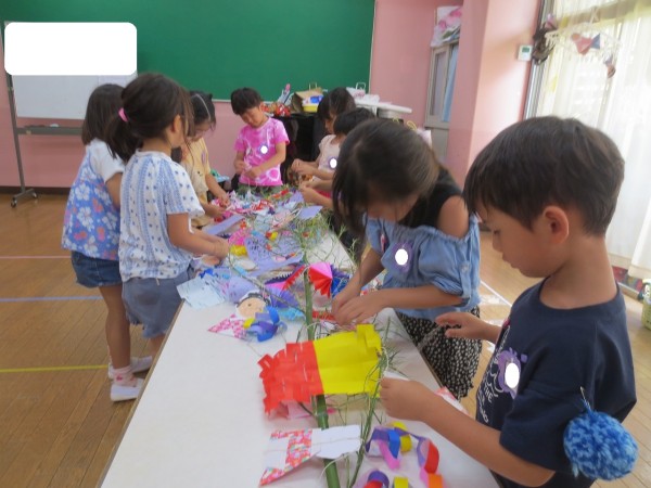 7月の行事予定 年長組(藤組) 7月の目標:「お泊り会を楽しみにしながらグループで話し合い、協力して活動する」 7月の活動 プール遊び・お泊り会に向けての活動・縁日の景品作り・敬老会のプレゼント作り 7月の歌 「七夕さま…