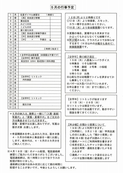 | 5月の活動 | はさみ遊び・栽培・製作遊び・遠足 |