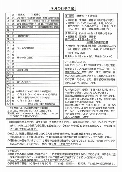 9月の目標:「園生活のリズムを取り戻す」「楽しく運動会の練習に取り組む」