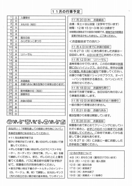 11月の目標:「お遊戯会に向けて、楽しく取り組む」「みんなで頑張り、劇や遊戯ができ上がっていく喜びを味わう」