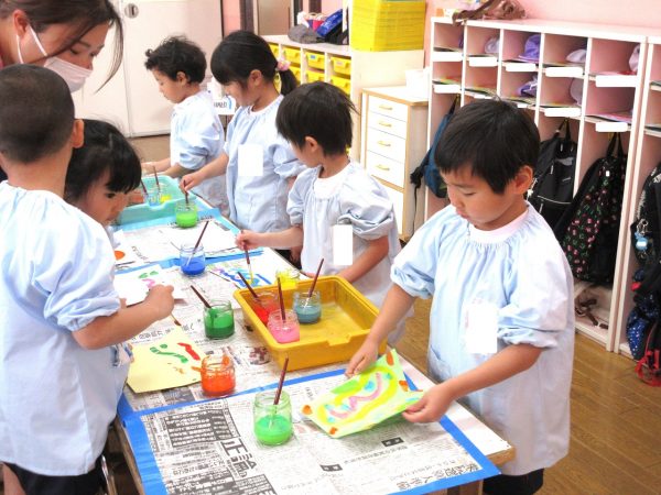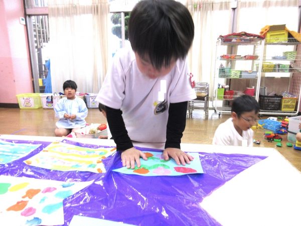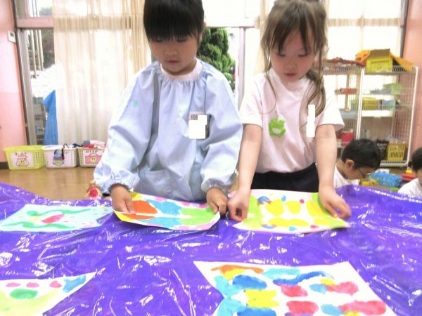🎏『こいのぼり製作』~みんなで大きなこいのぼりを作るよ。ウロコの形の台紙にデカルコマニーで色付けしたんだ! 色が乾いたら、大きなこいのぼりにウロコをつけて⋯