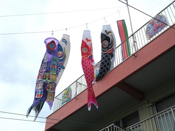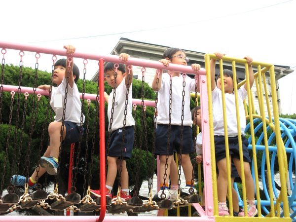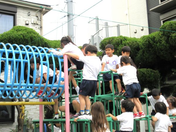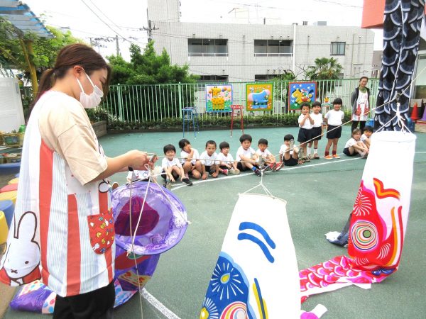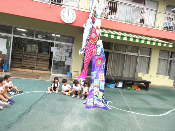 😉『こいのぼりをあげたよ!』~でき上がったこいのぼりをあげたよ。およいでいるこいのぼりに近づきたくて、遊具の上にのぼったんだ!