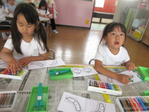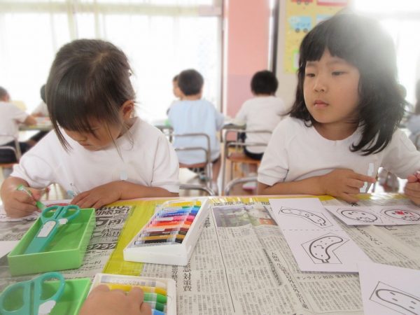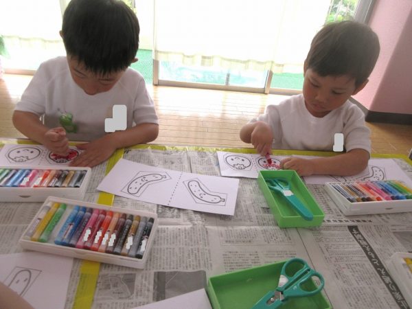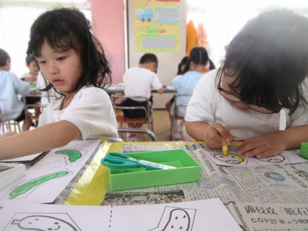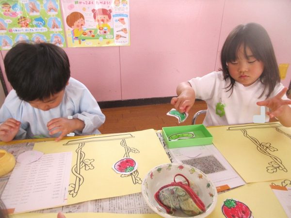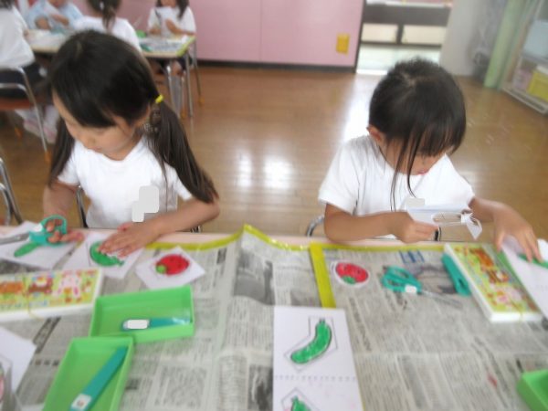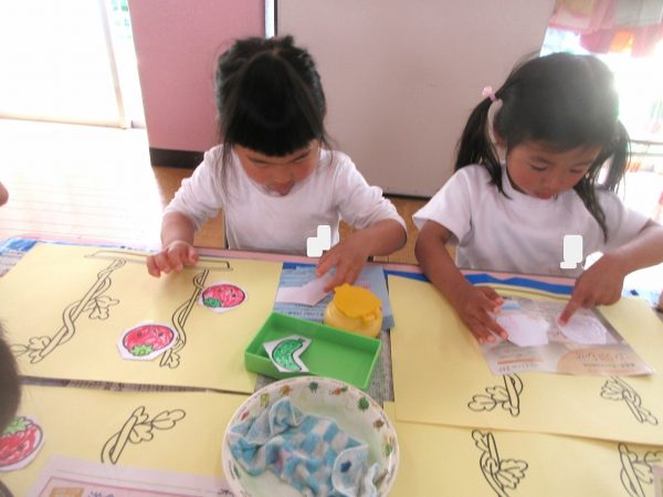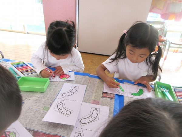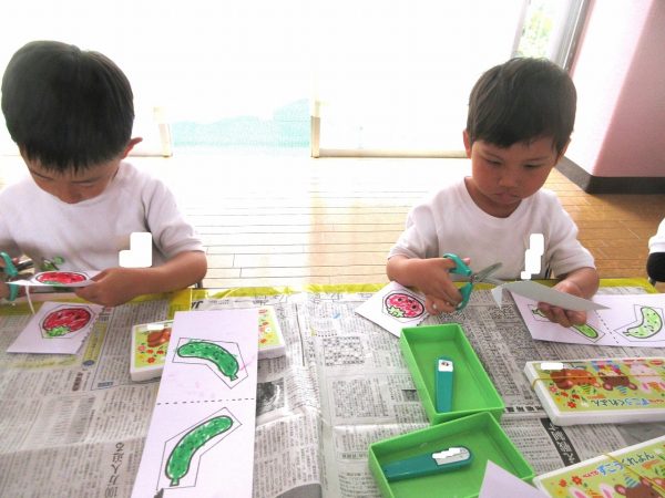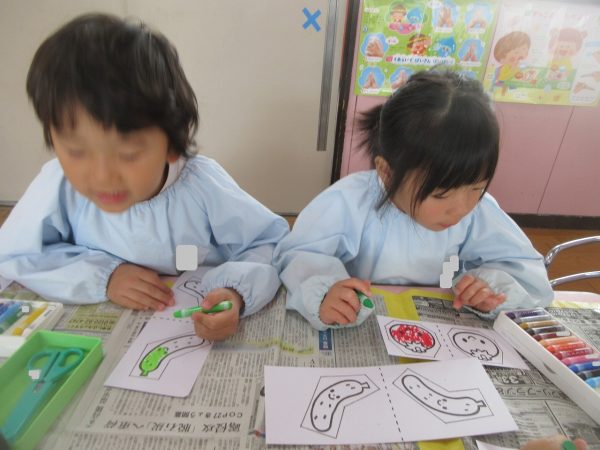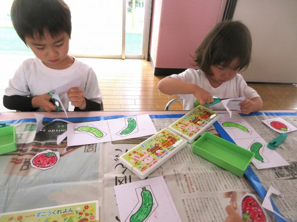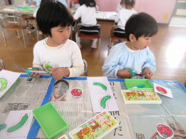 ✂️『はさみ遊び』~トマト・キュウリにクレヨンで色をつけてから、はさみで丁寧に切ったよ。ツルが描いてある台紙にのりで貼ったんだ!