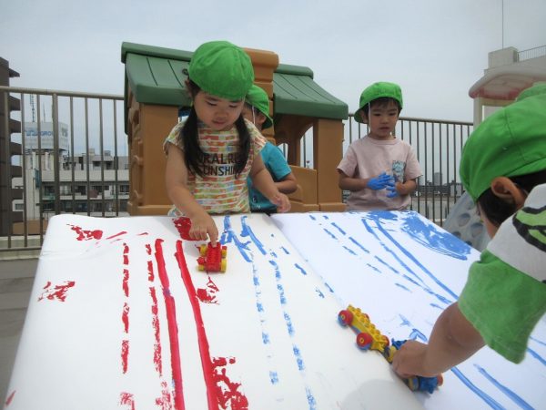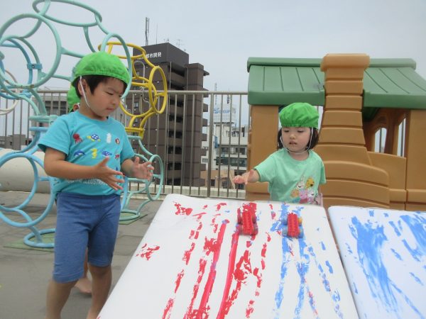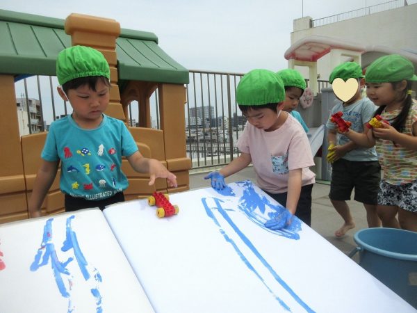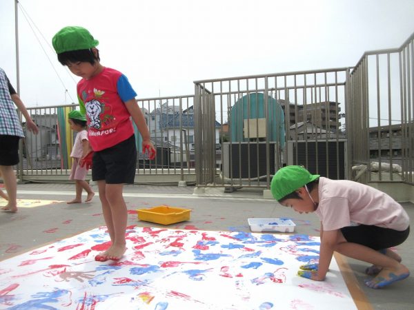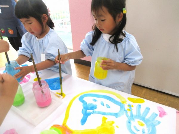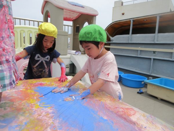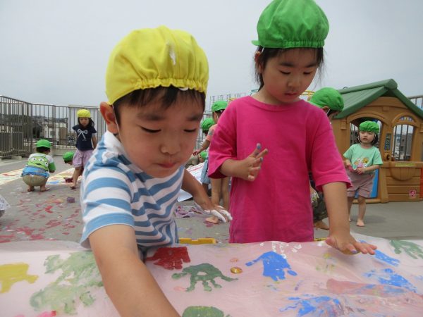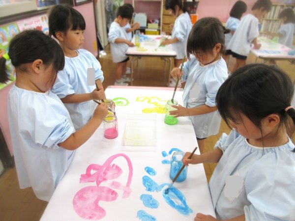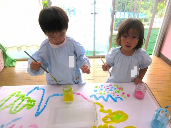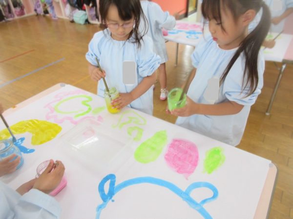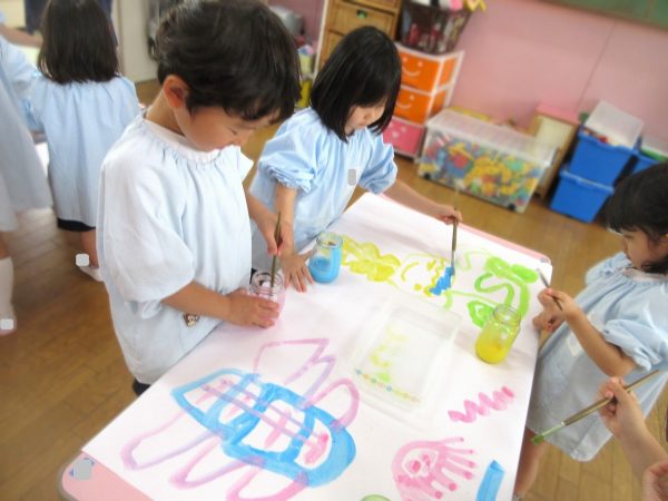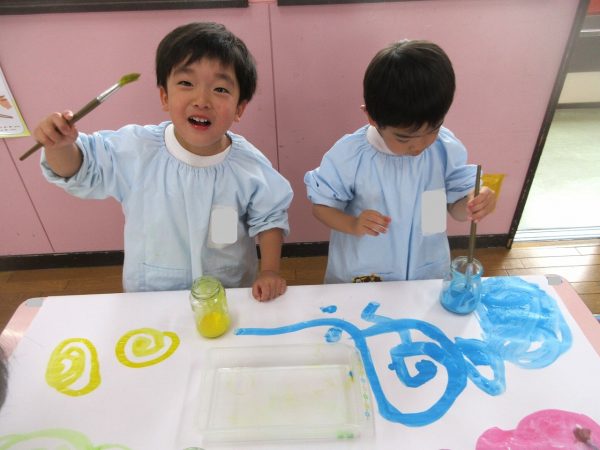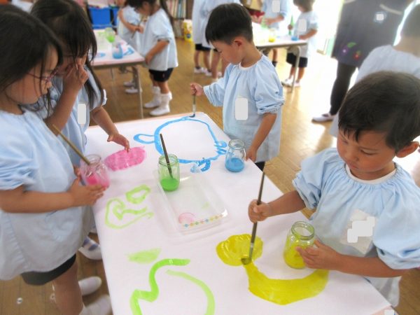 🖌『絵の具遊び』~大きな紙に筆を使って、自由にのびのびと描いたよ。遠足で水族館に行く日が近かったので、魚や生き物を描くお友だちもいたんだ!