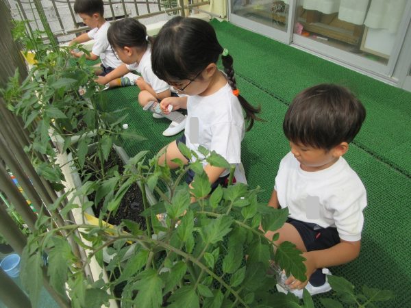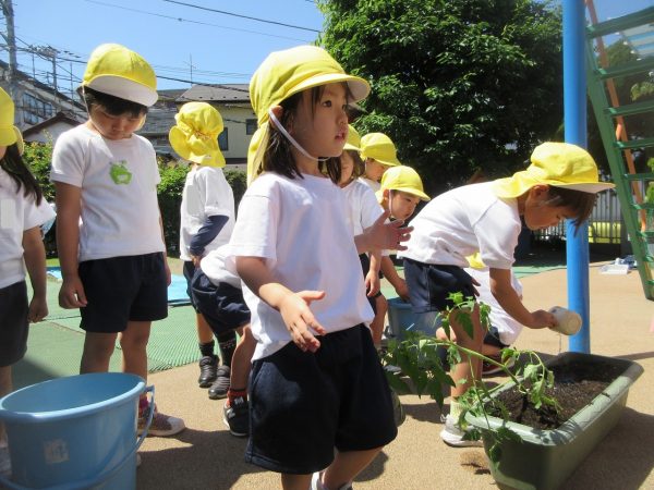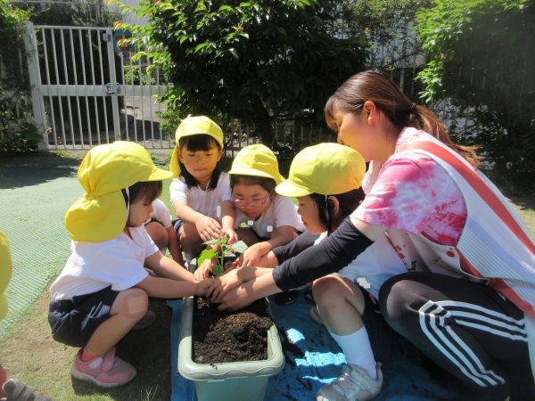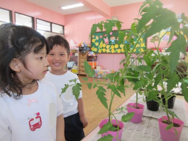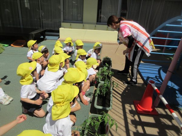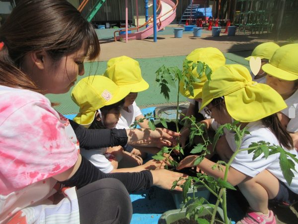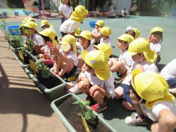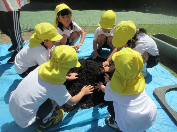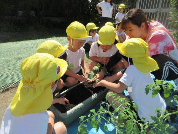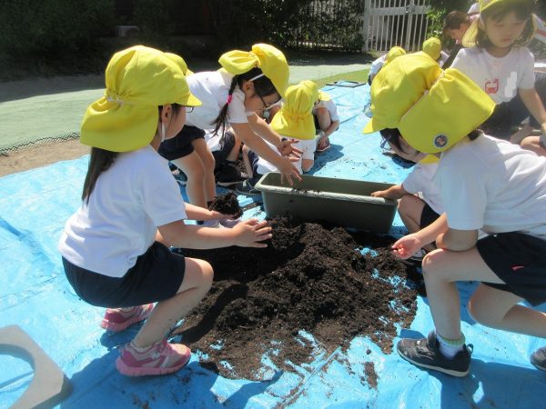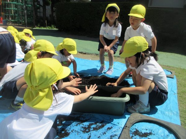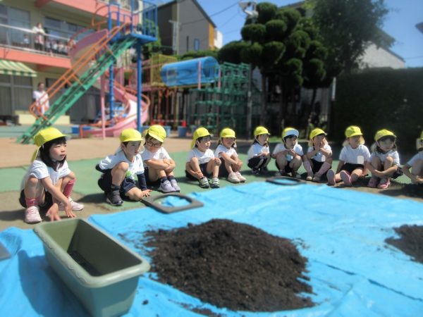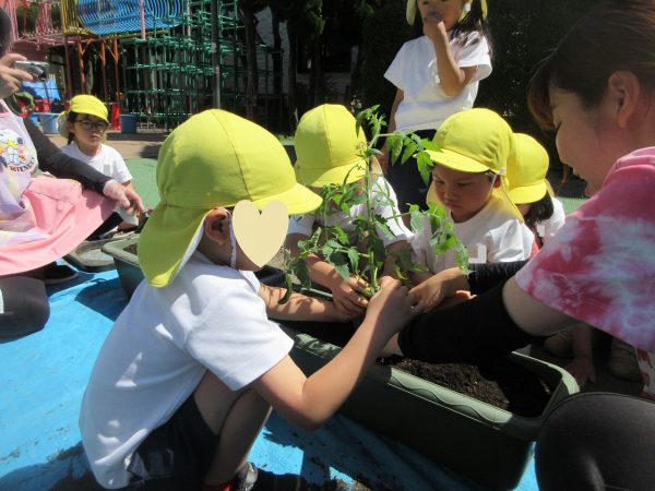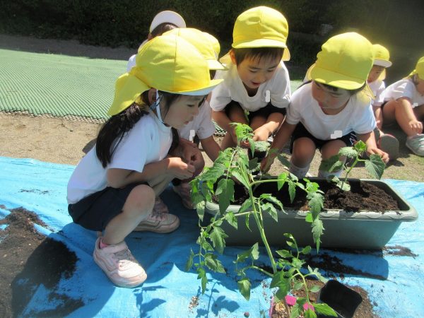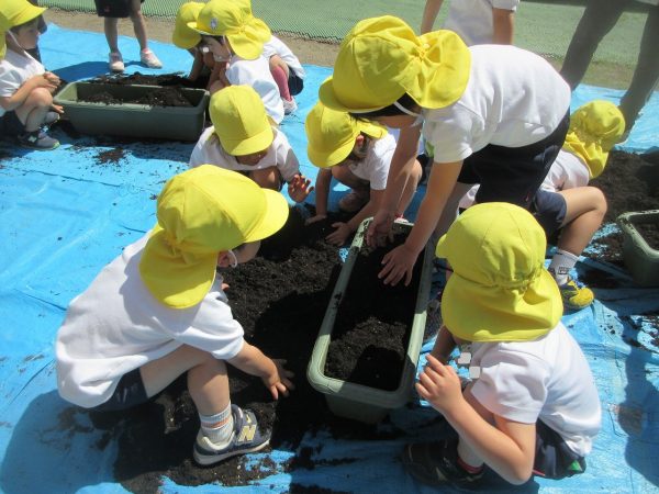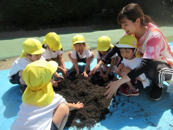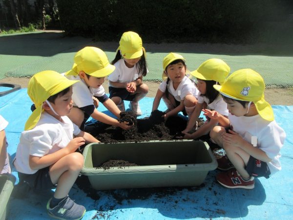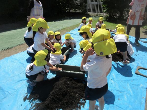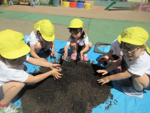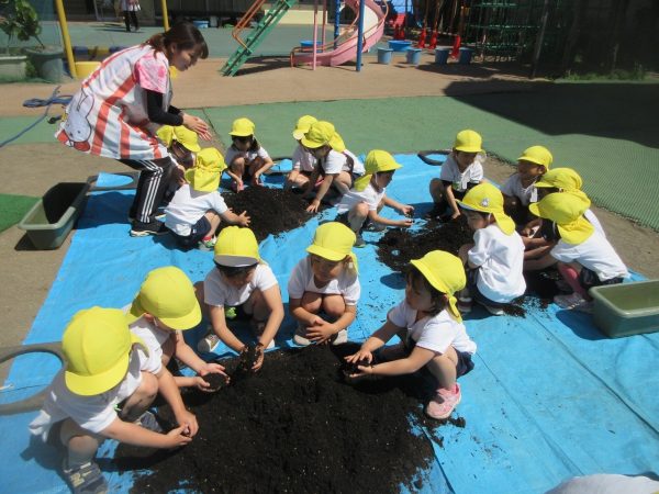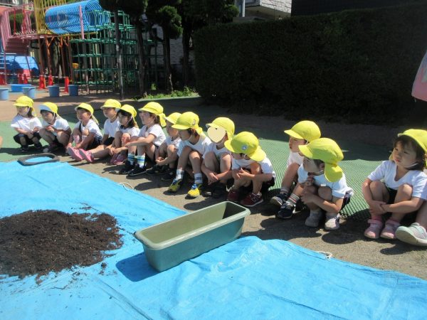 🥒『本物の⋯ 野菜が⋯』🍅~朝 登園すると、トマトとキュウリの苗があったよ。苗を持って、園庭へ! 腐葉土をよーく混ぜ込んで土作り。