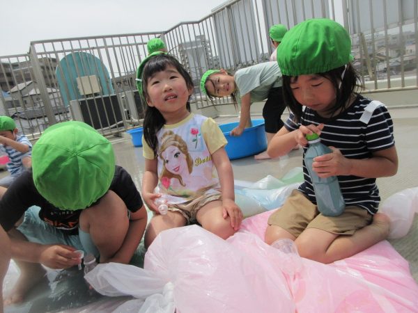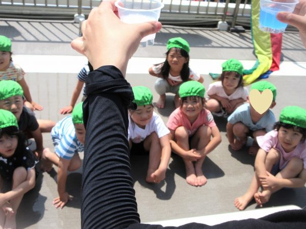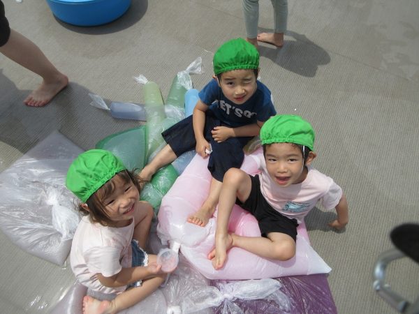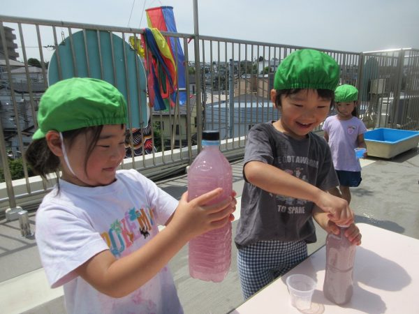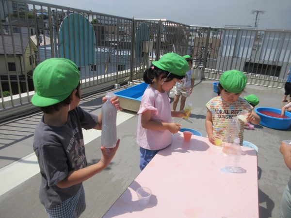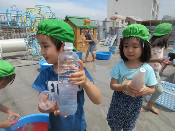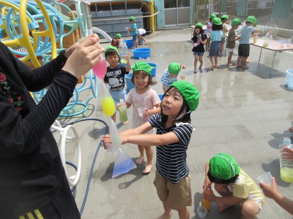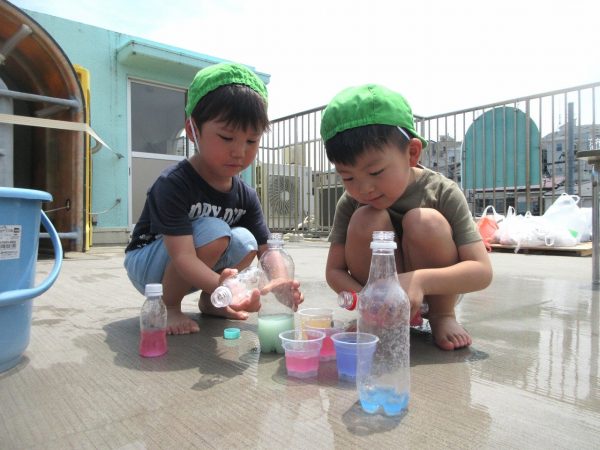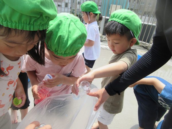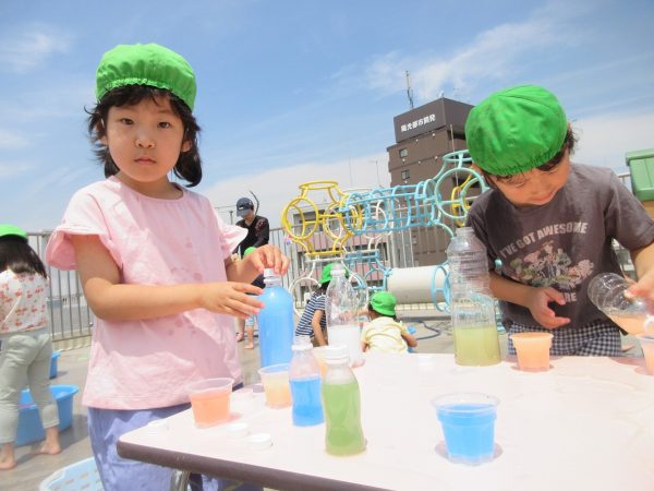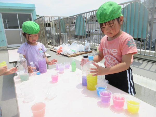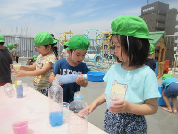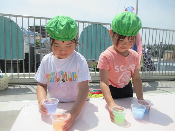 😝『色水遊び』~プリンカップやペットボトルを使って、色水遊びを楽しんだよ。「〇〇色と△△色を混ぜたら どうなる!?」と混色を楽しんだり、ポリ袋に色水を入れてザブトンにして、寝転んだりもしたんだ!