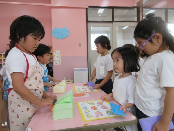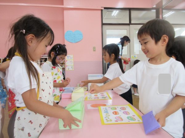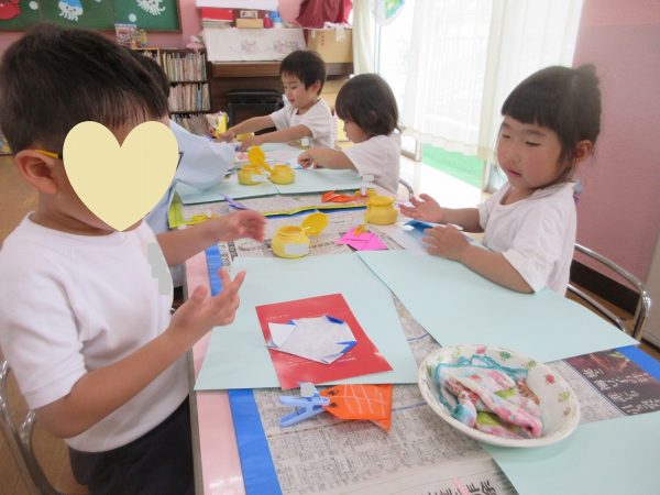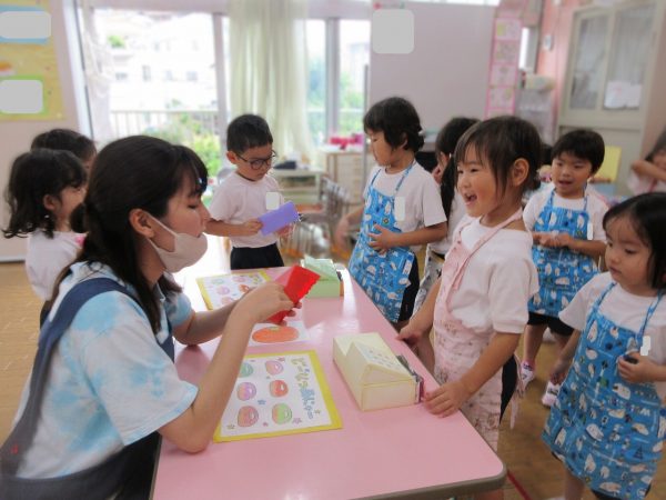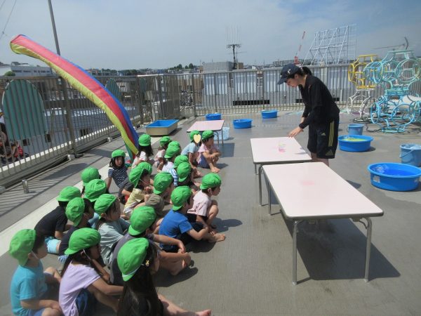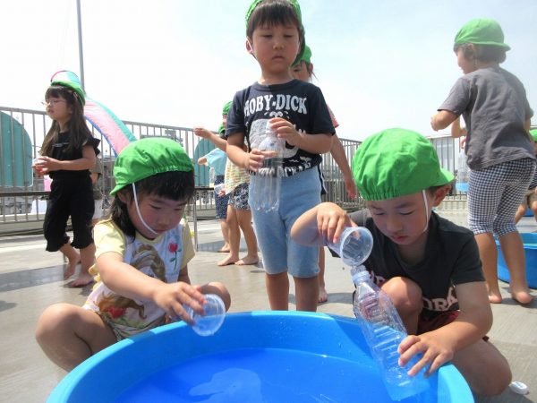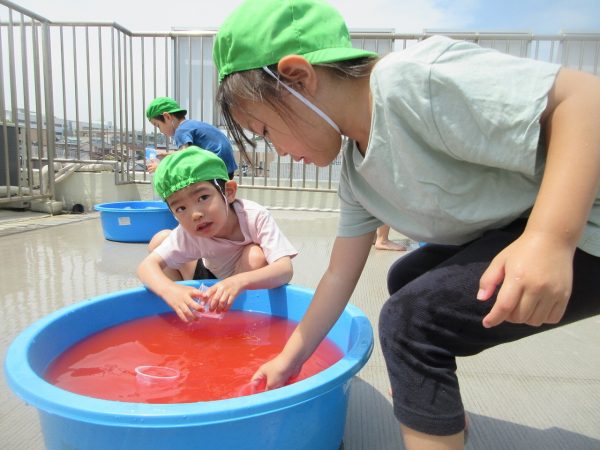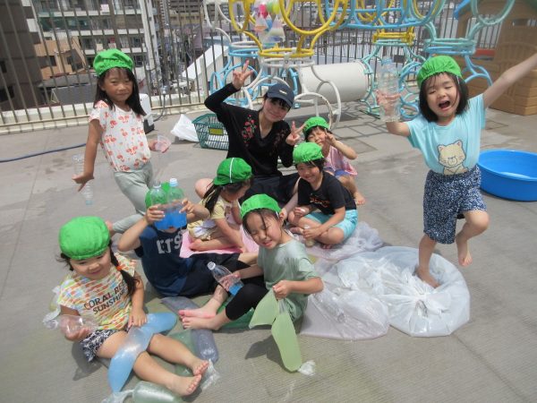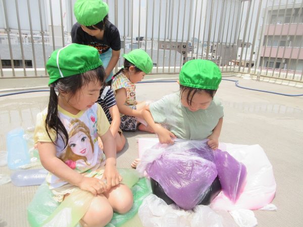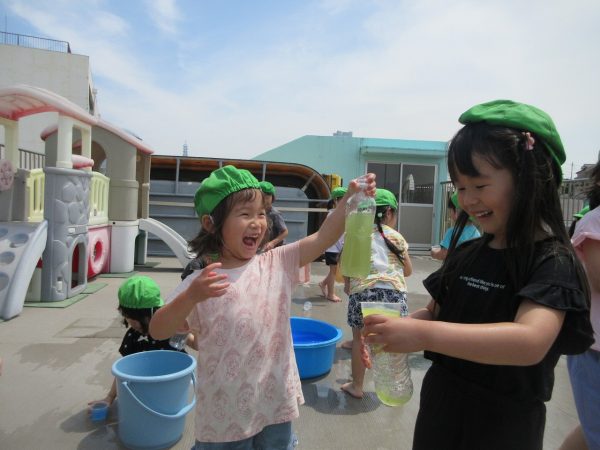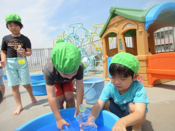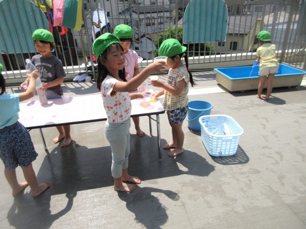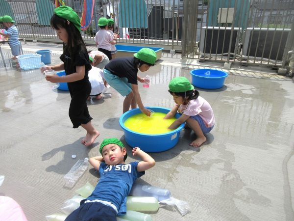 😝『色水遊び』~プリンカップやペットボトルを使って、色水遊びを楽しんだよ。「〇〇色と△△色を混ぜたら どうなる!?」と混色を楽しんだり、ポリ袋に色水を入れてザブトンにして、寝転んだりもしたんだ!