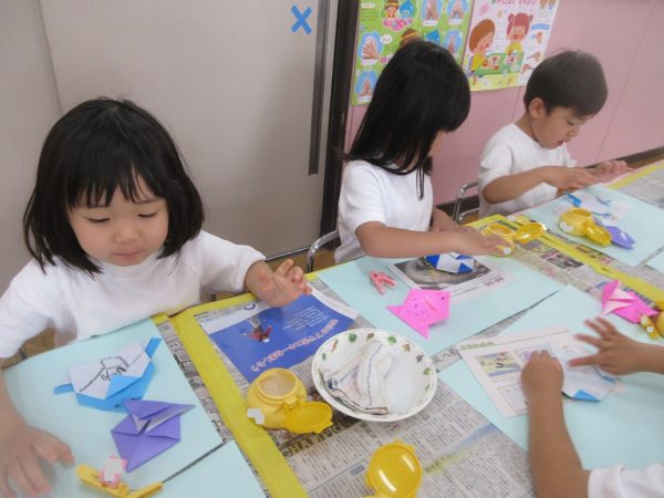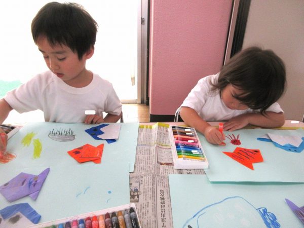 🐠『折り紙で⋯』🐧~折り紙で魚とペンギンを折って、台紙に貼ったよ。クレヨンで顔やからだに模様を描いたり、タコやクラゲなどの他の生き物も描いたんだ!