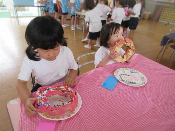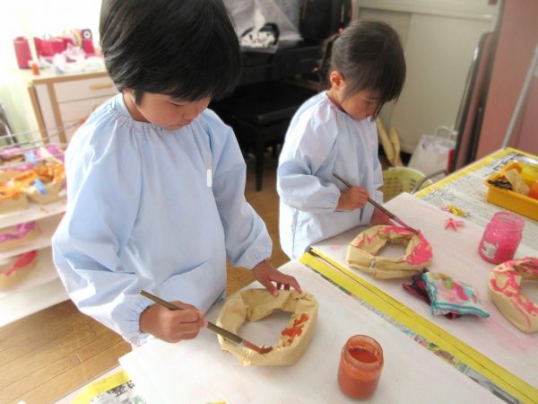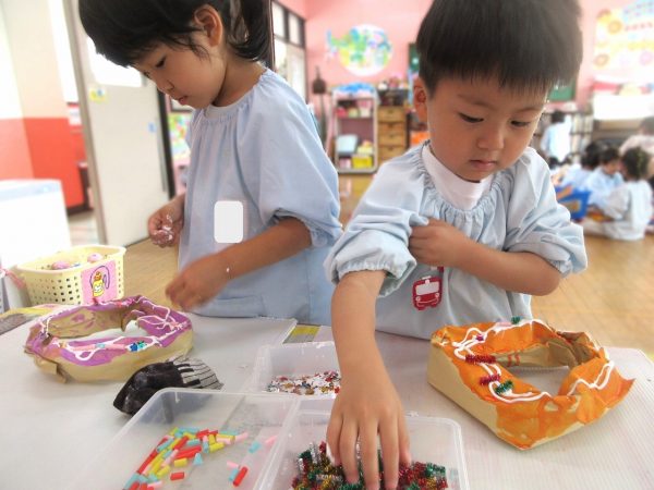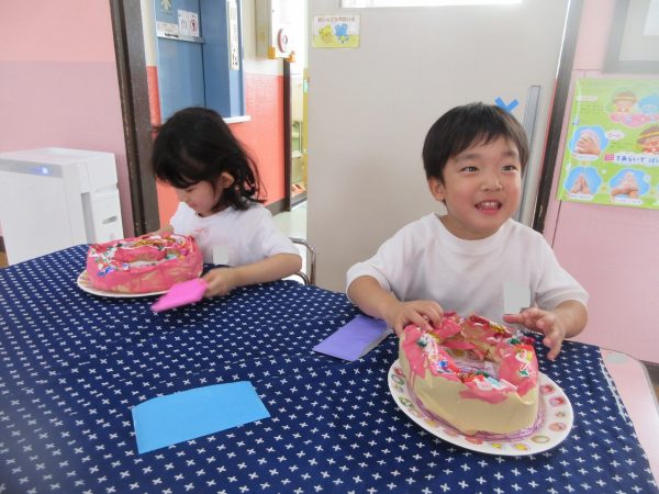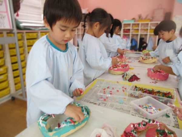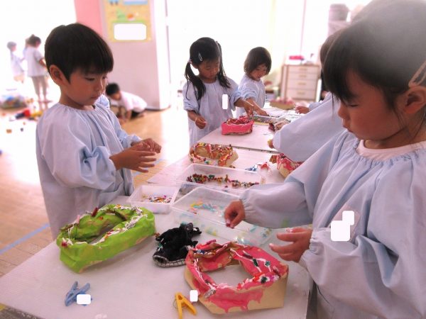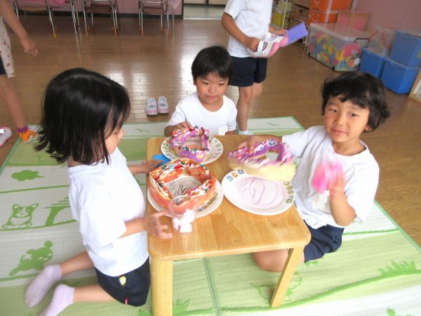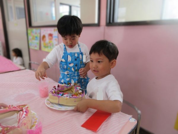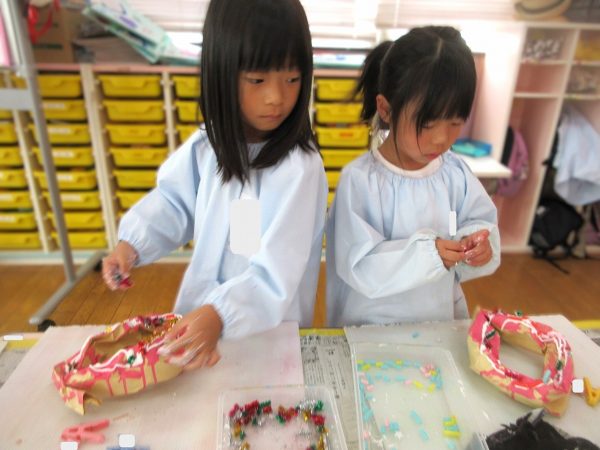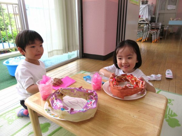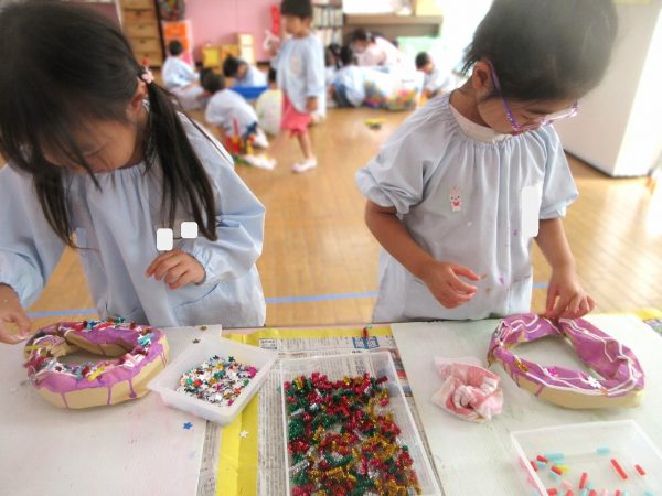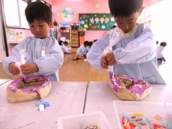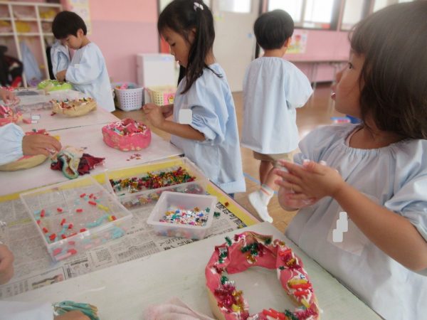 🙂『おいしくな~れ⋯』~絵の具で色をつけたドーナツに、クリームをしぼってのせたり、トッピングをして楽しんだよ。「おいしいドーナツの できあがりー!」