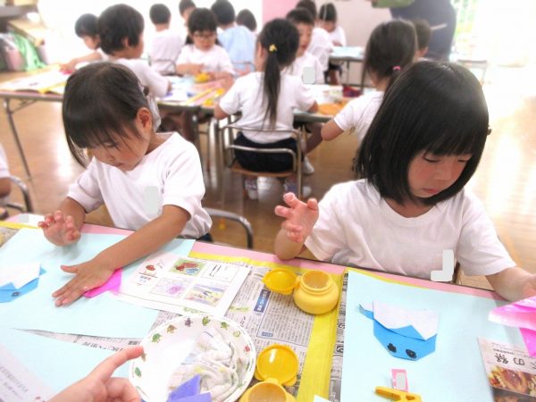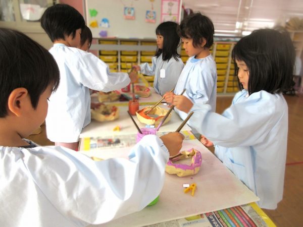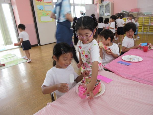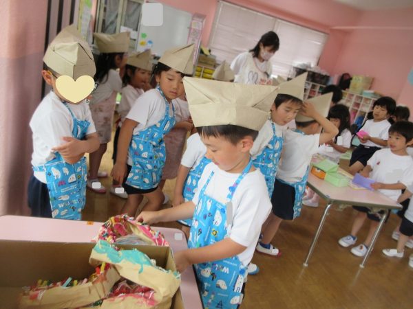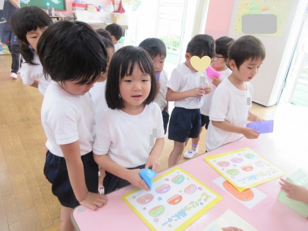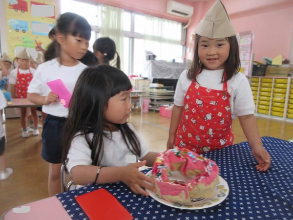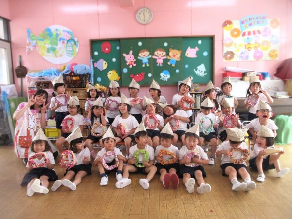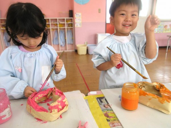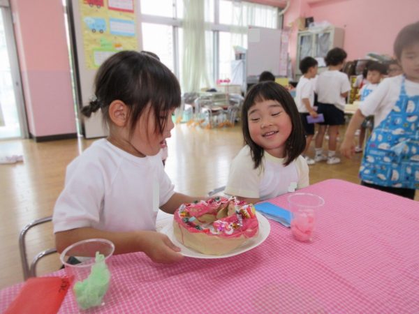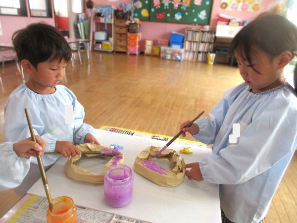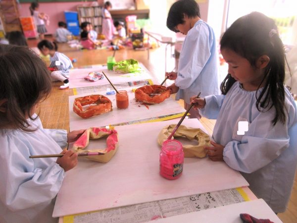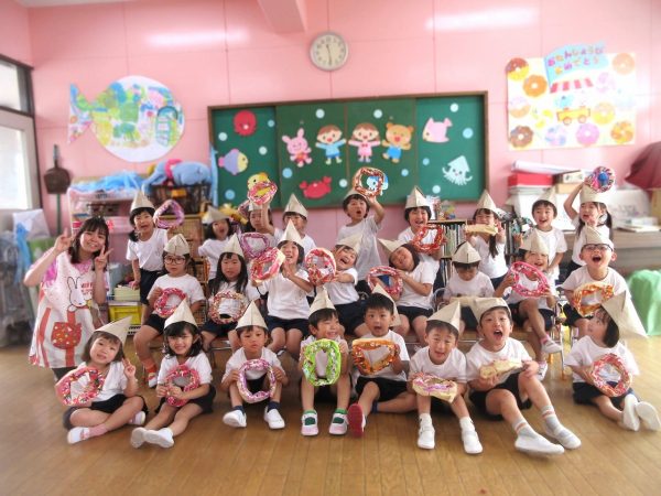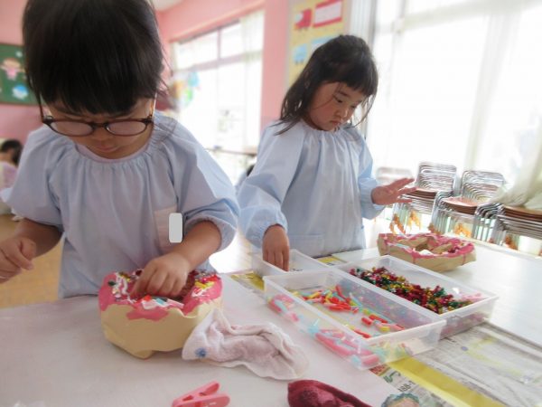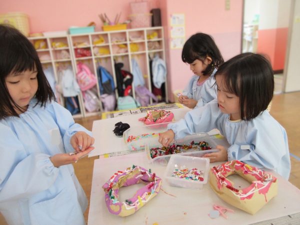 🙂『おいしくな~れ⋯』~絵の具で色をつけたドーナツに、クリームをしぼってのせたり、トッピングをして楽しんだよ。「おいしいドーナツの できあがりー!」