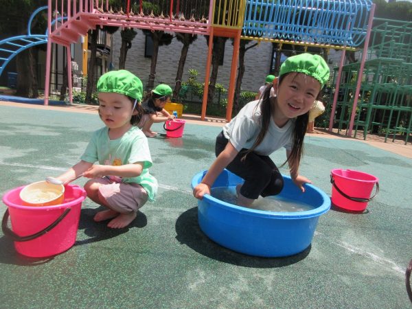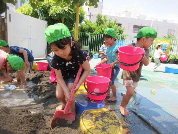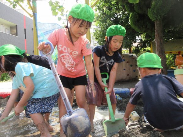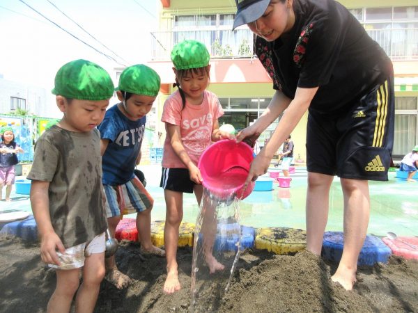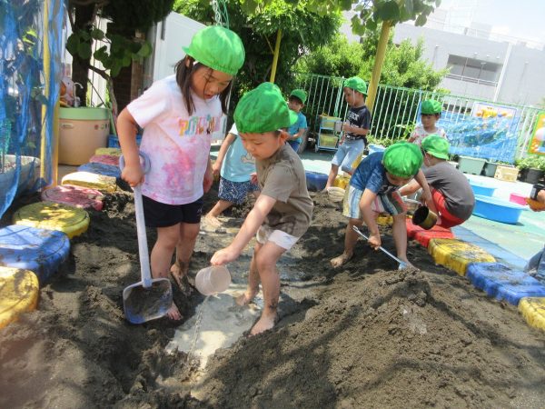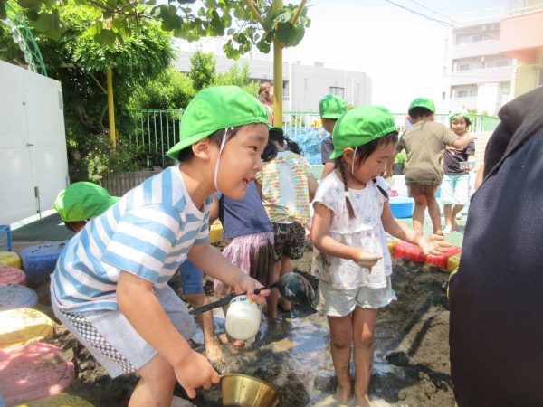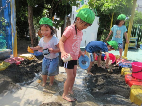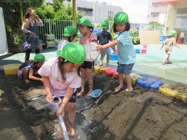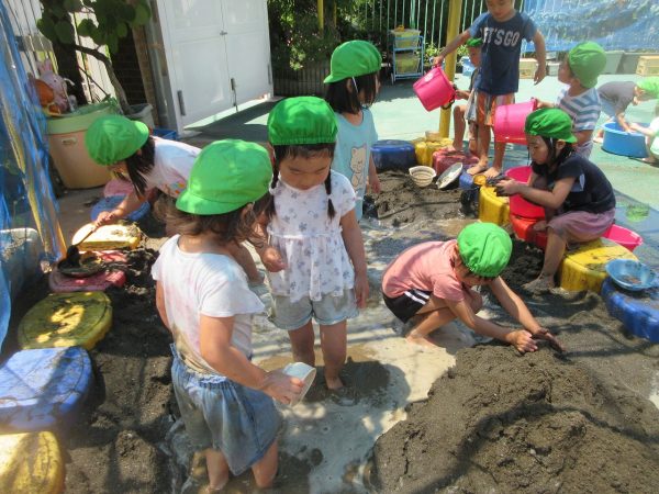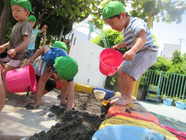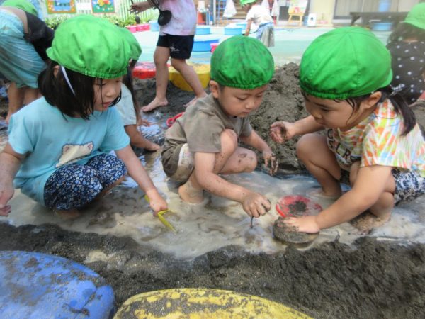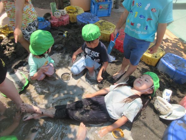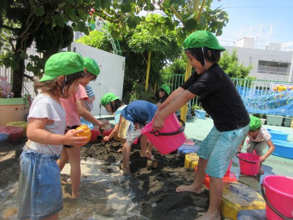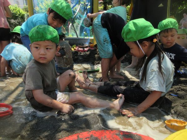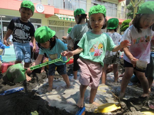 🚿『泥んこ遊び』~お水をいっぱい入れて、砂場のオモチャやバケツも使って、思いっきり遊んだよ。ビシャビシャ!、バシャバシャ‼