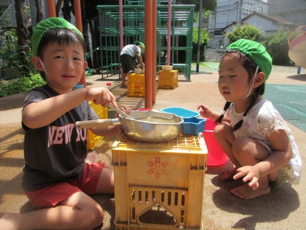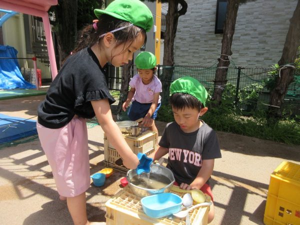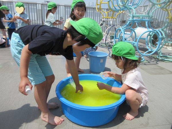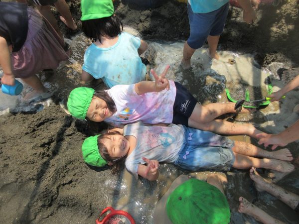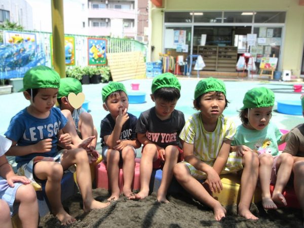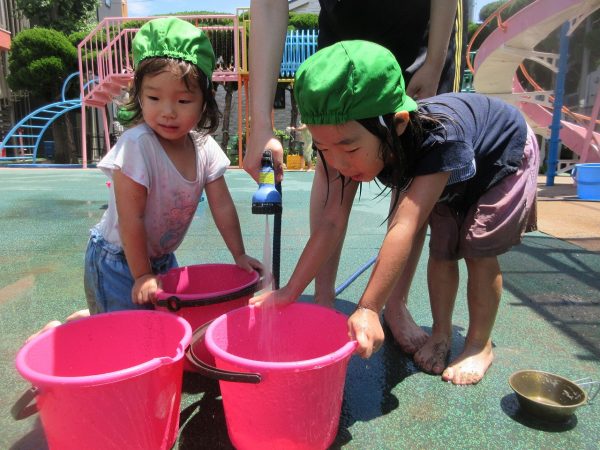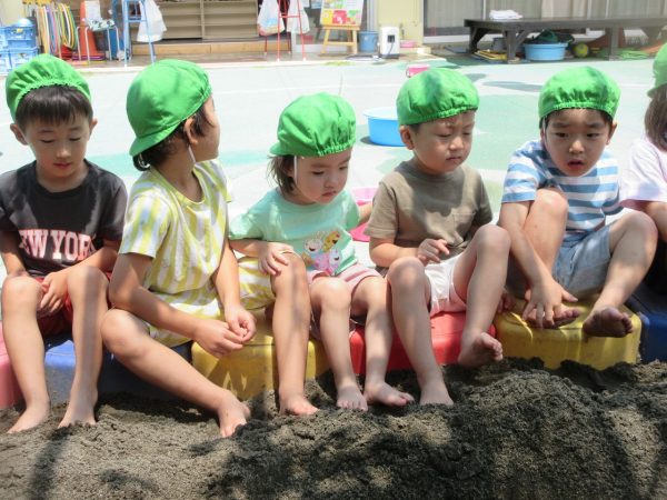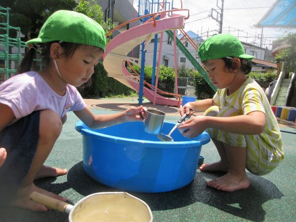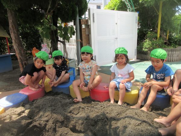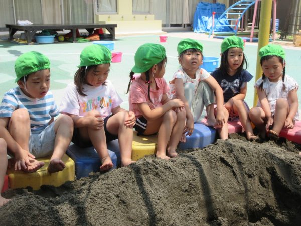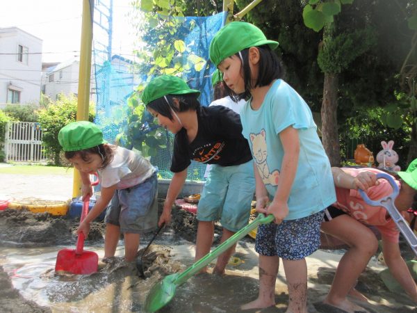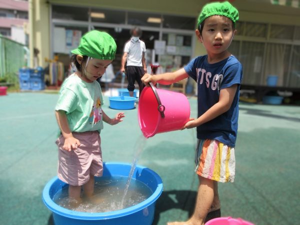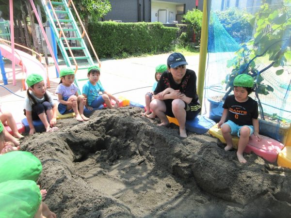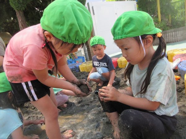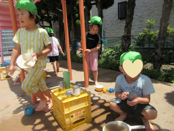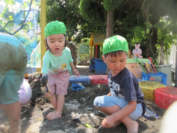 🚿『泥んこ遊び』~お水をいっぱい入れて、砂場のオモチャやバケツも使って、思いっきり遊んだよ。ビシャビシャ!、バシャバシャ‼