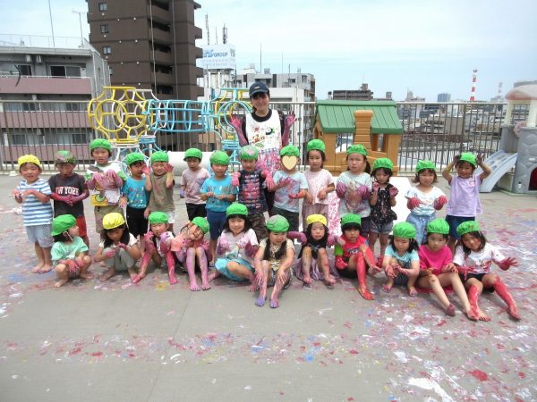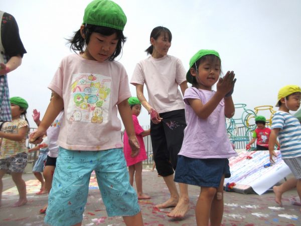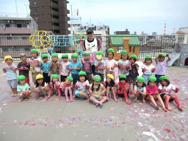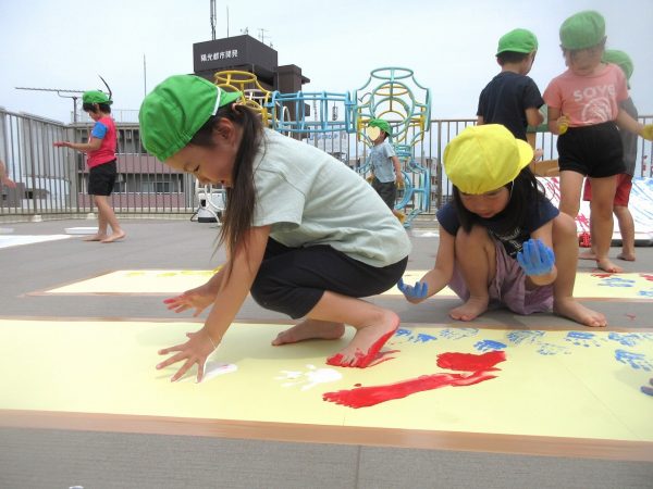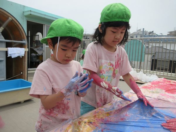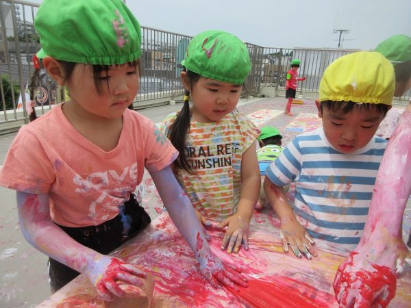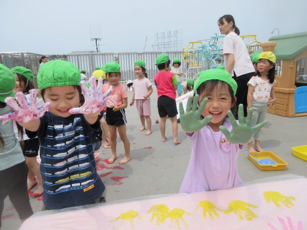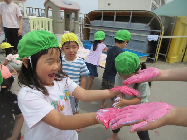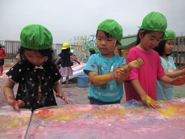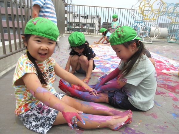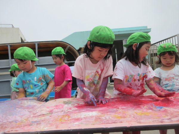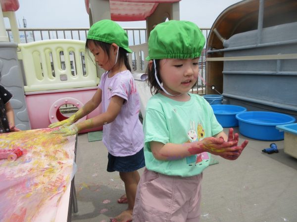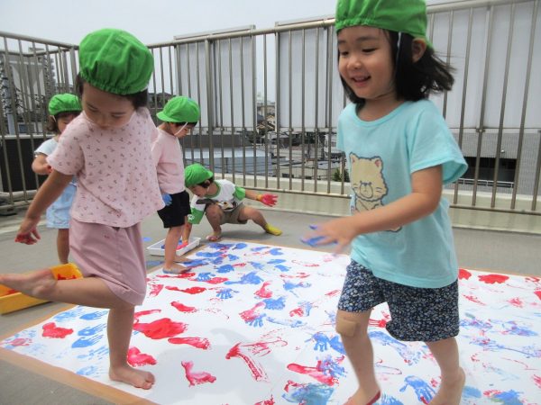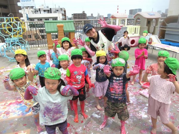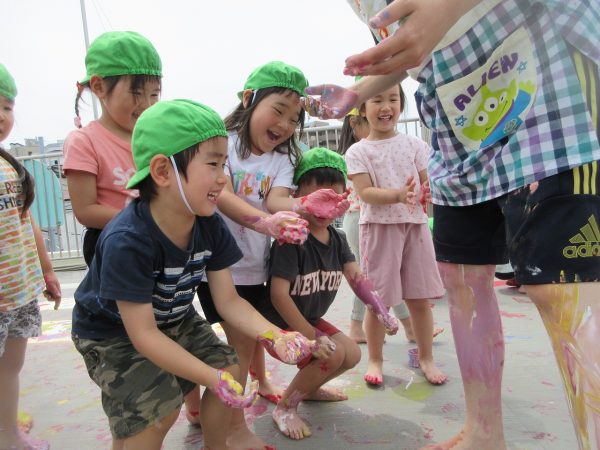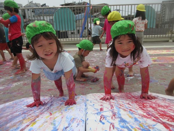 😮『顔にまで⋯』~手や足に絵の具をつけて、ボディーペインティングを思いっきり楽しんだよ。ノリノリになっちゃって、顔にまで絵の具をつけて遊んじゃったんだ!