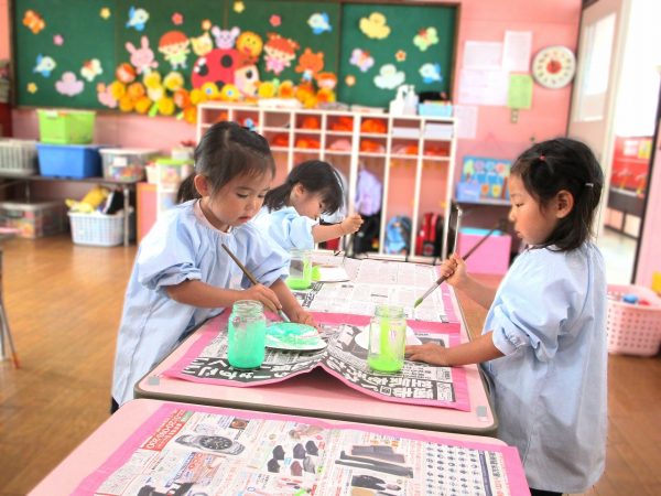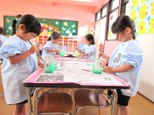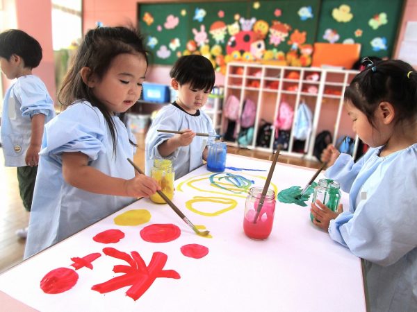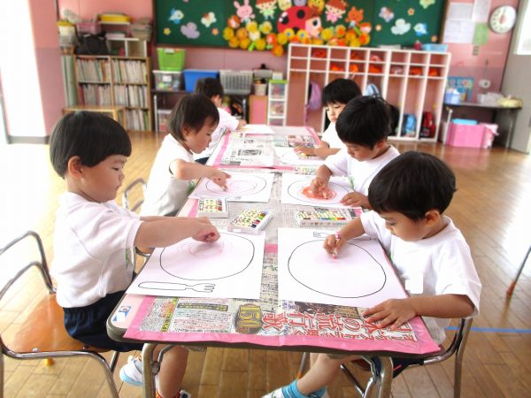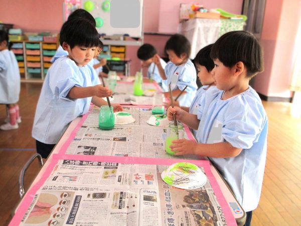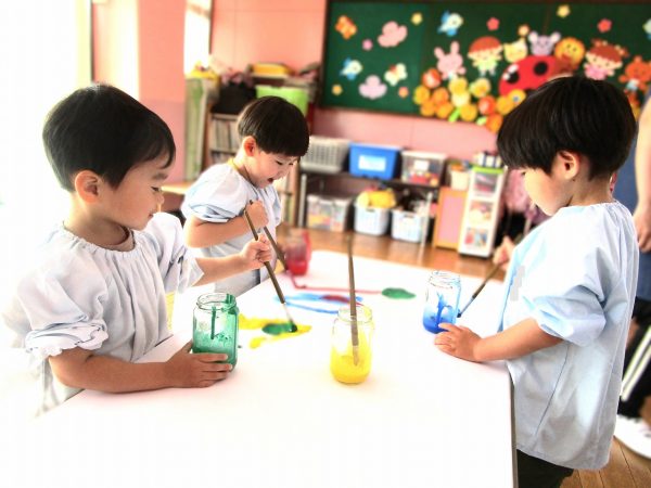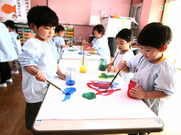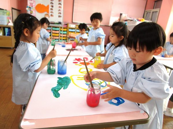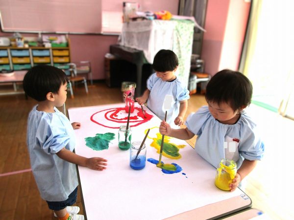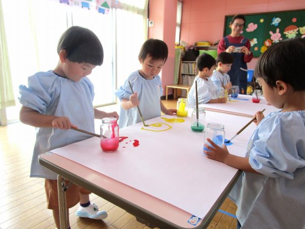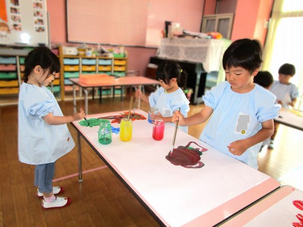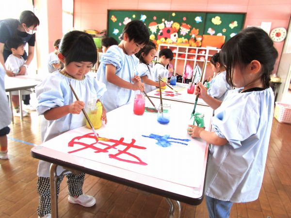 🖌『絵の具遊び』~筆を持って、大きい模造紙にのびのびと描いたよ。絵の具って すーっと描けて、楽しいね!