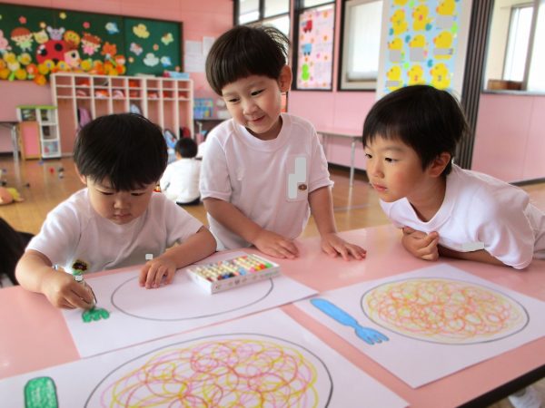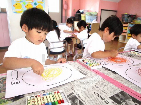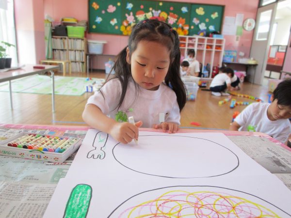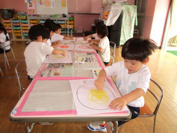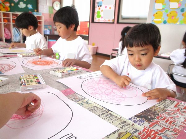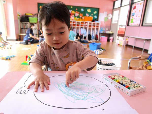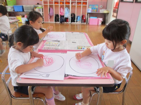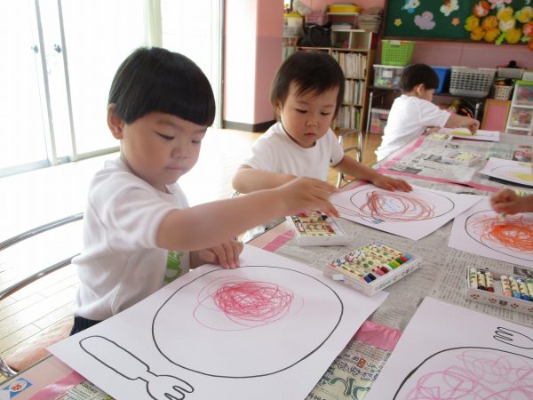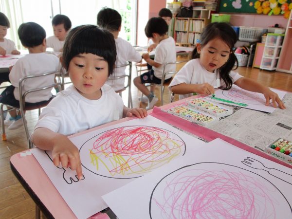 🍝『クレヨン遊び』~台紙に描かれたお皿にスパゲティをのせようと、クレヨンでグルグルと楽しく描いたよ。おいしそうなスパゲティができたでしょ!