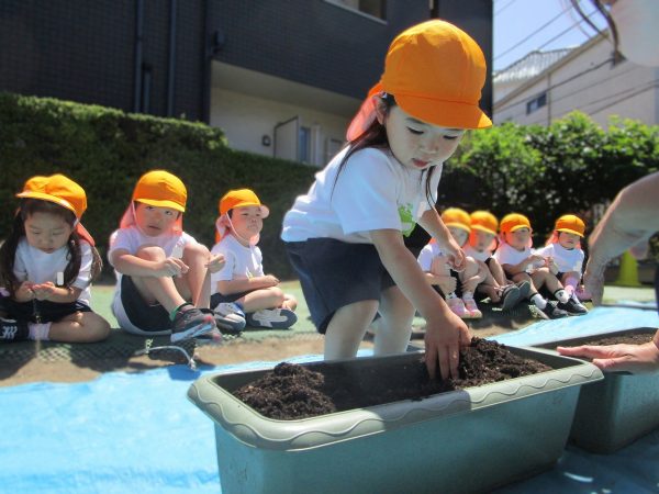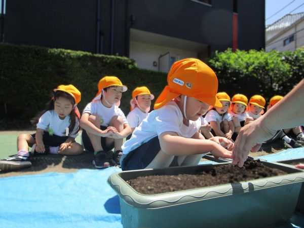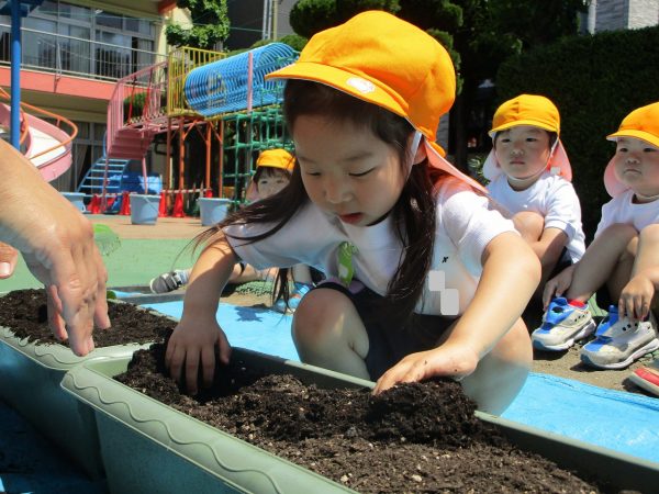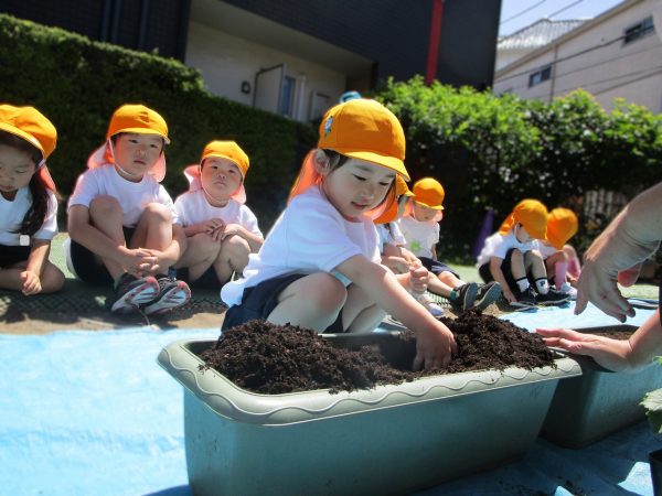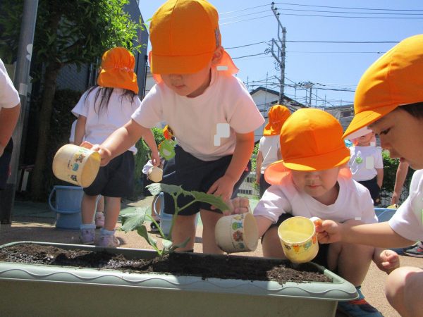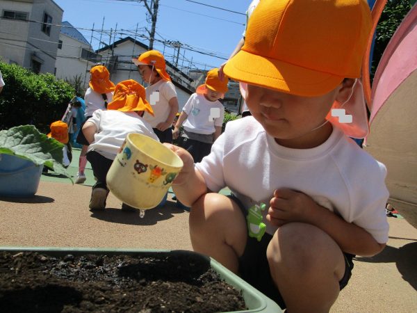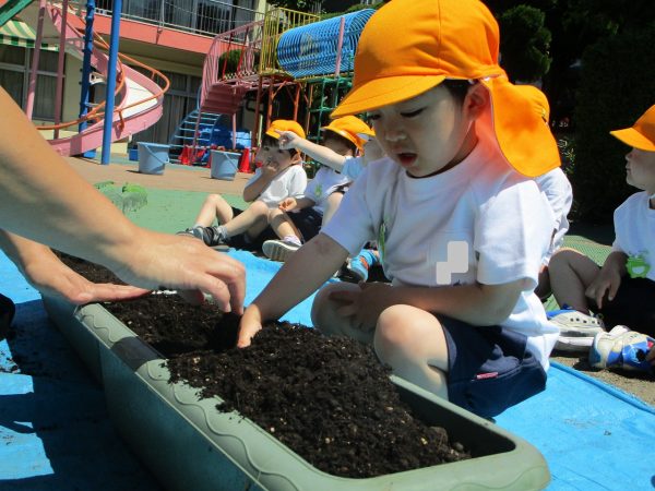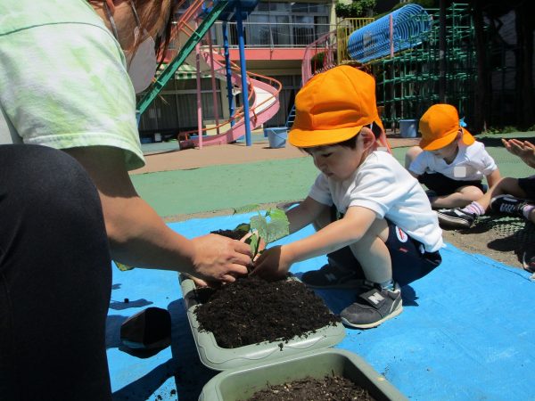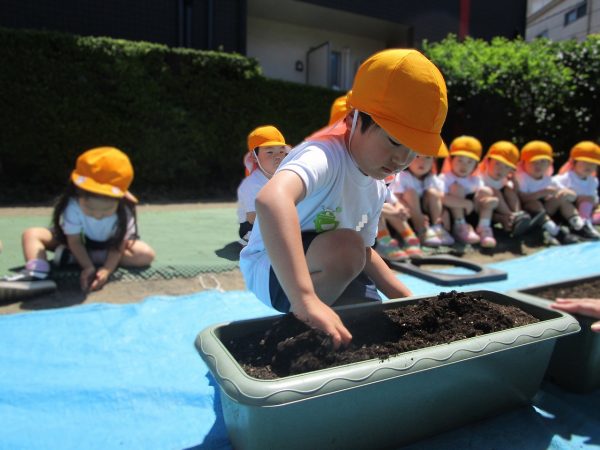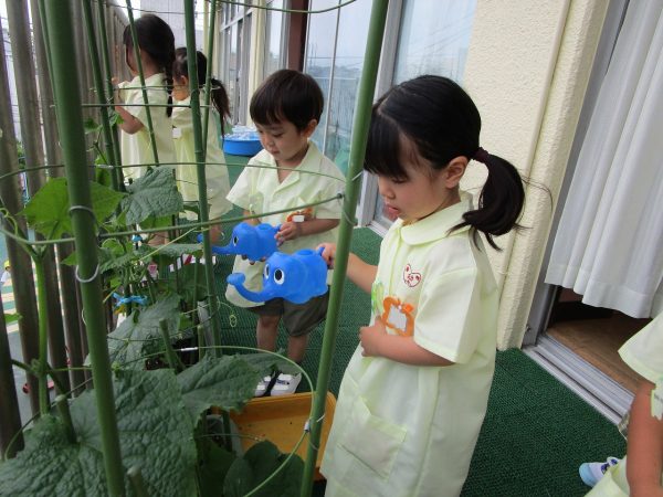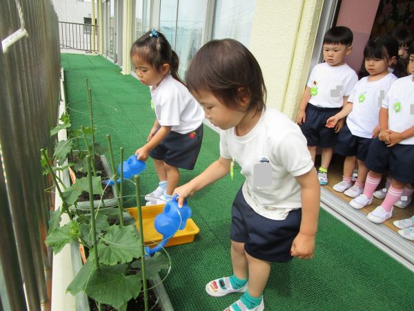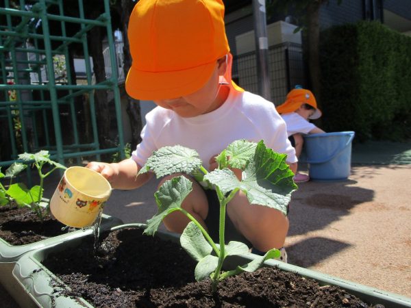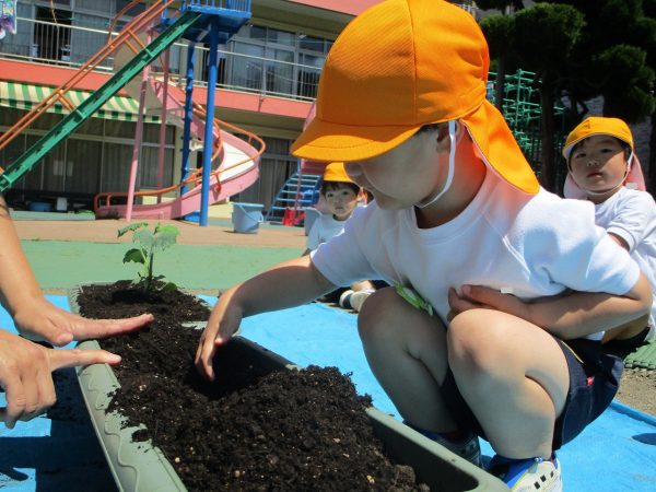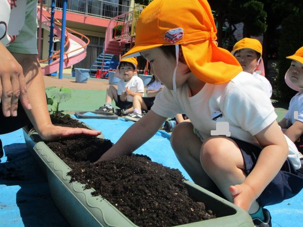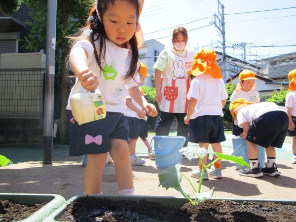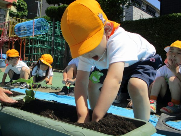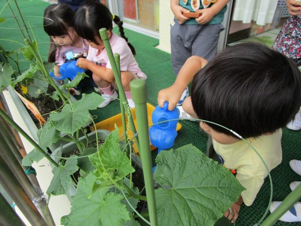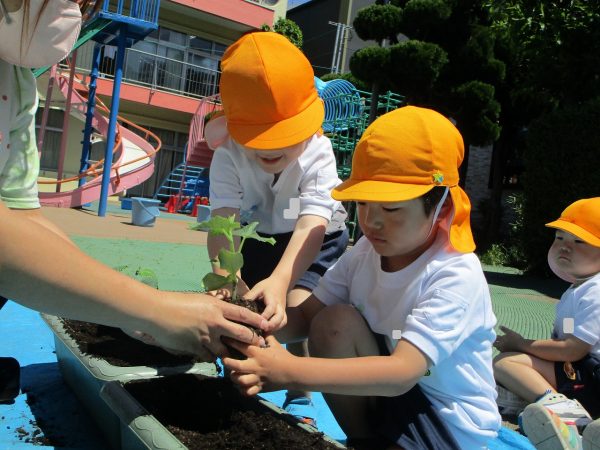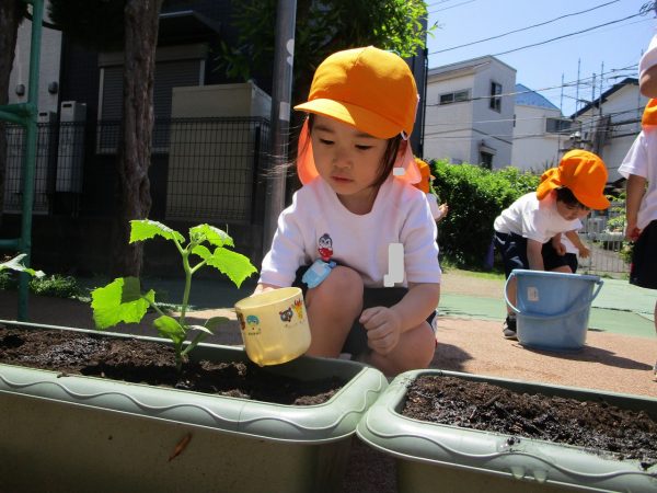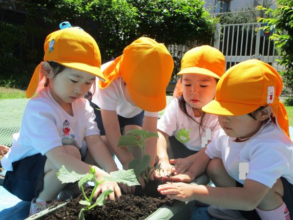 🥒『苗植え』~キュウリの苗を優しく植えてあげたよ。その後でお水をたっぷりあげたんだ! 晴れた日には交替で、お水やりをしたよ。「おいしいキュウリが いっぱいできますように‼」