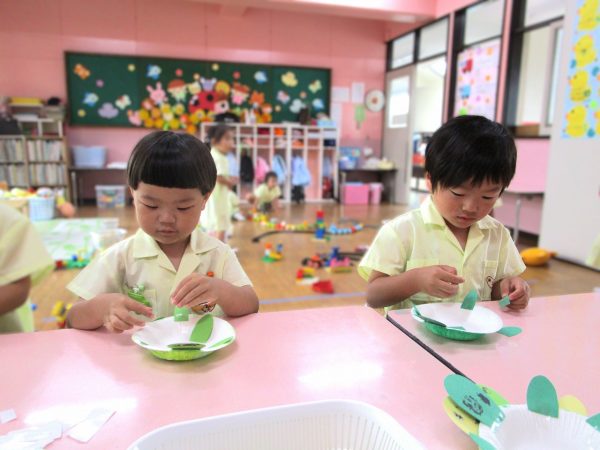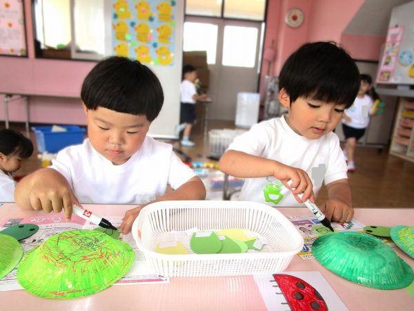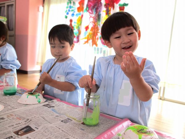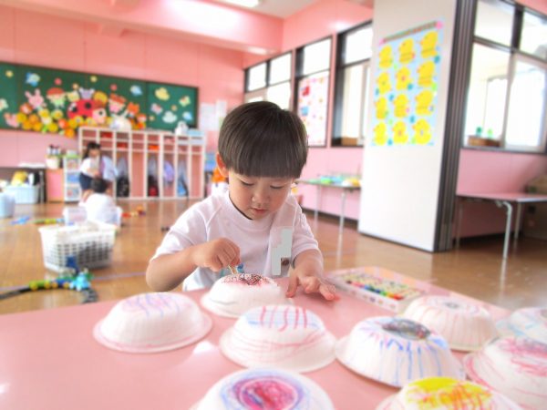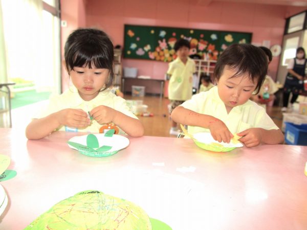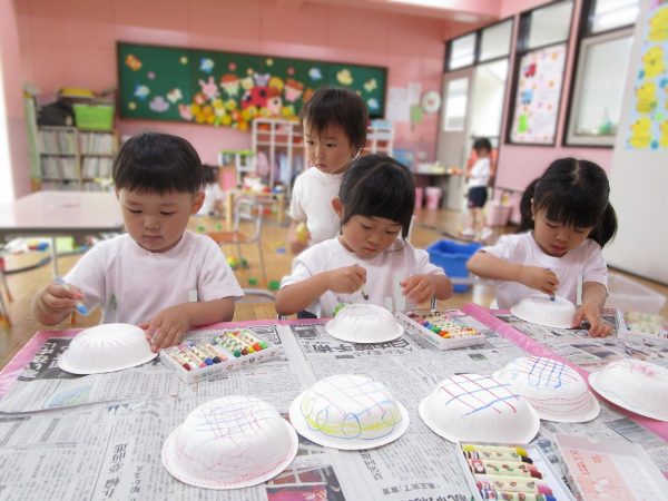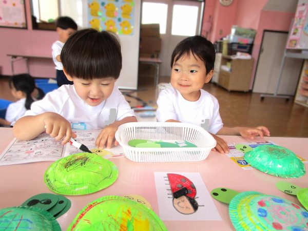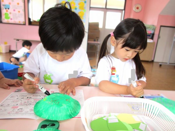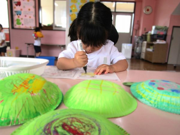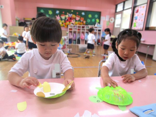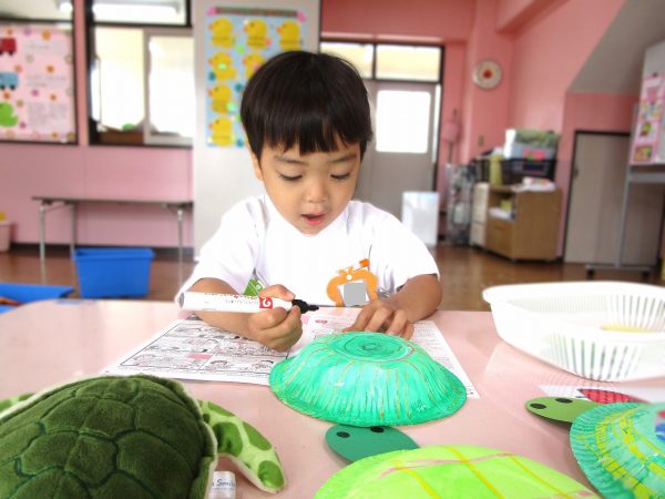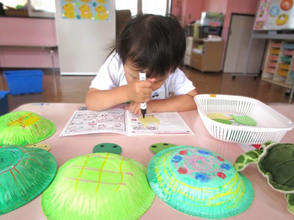 🐢『工作遊び』~カメを作ることにしたよ。お皿(コウラ)をクレヨンで模様をつけて、絵の具で色づけしたんだ!