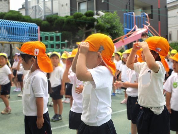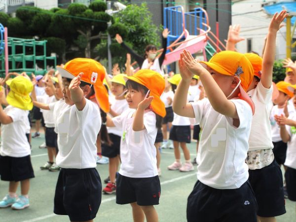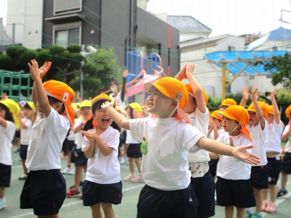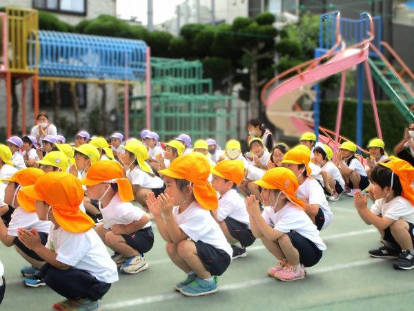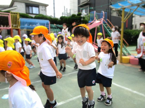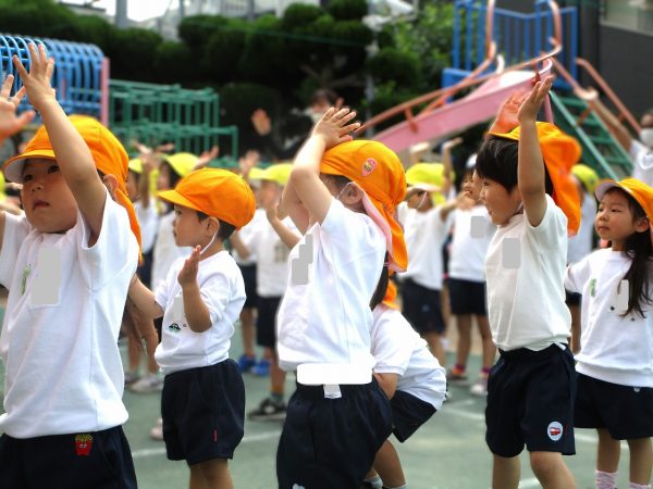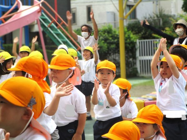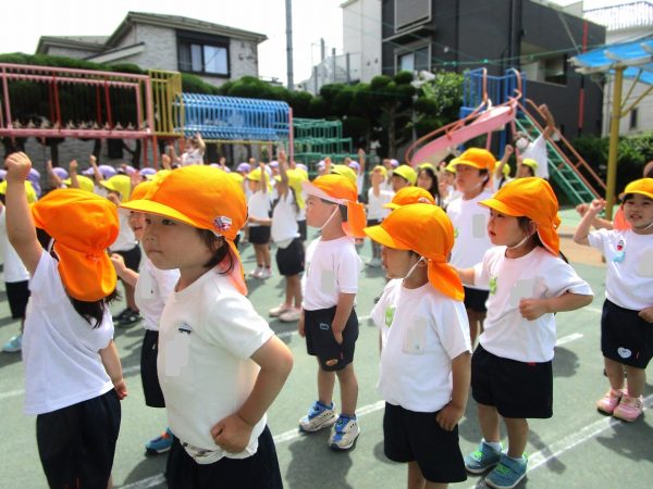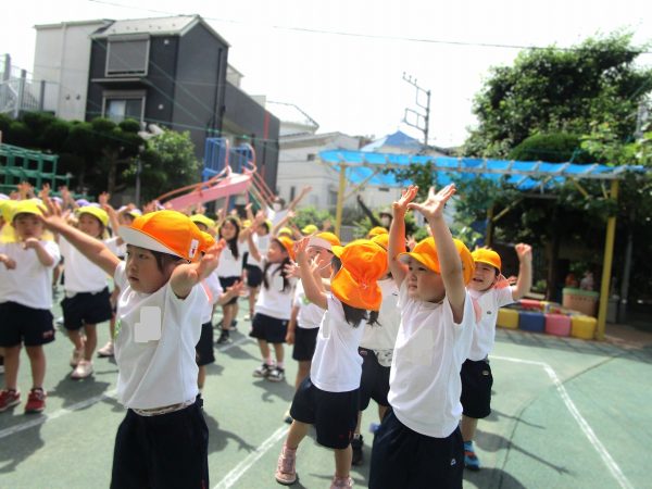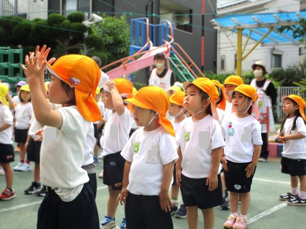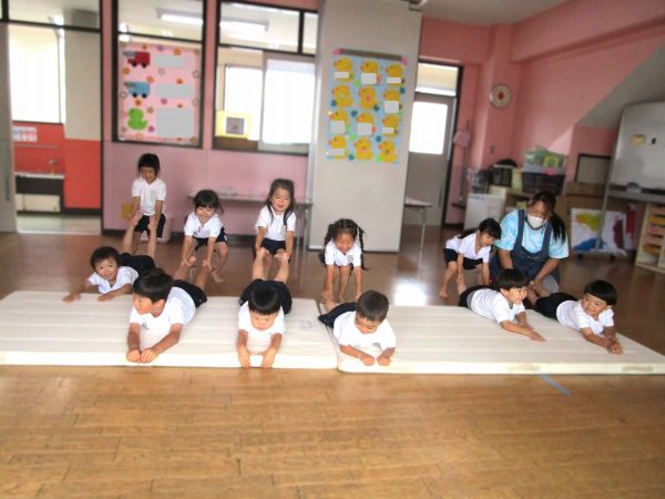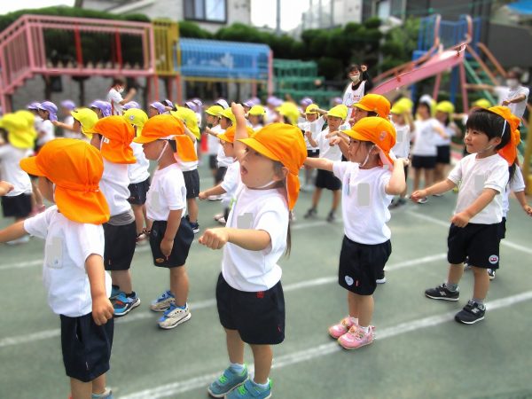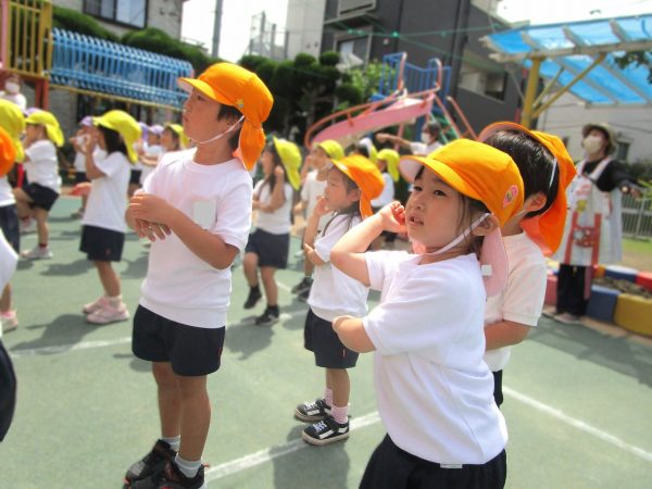 🌞『朝礼、体操』~年少さんも朝礼に参加したよ。2列に整列してみたり、体操もしたんだ! 体をいっぱい動かすと、気持ちがいいね‼