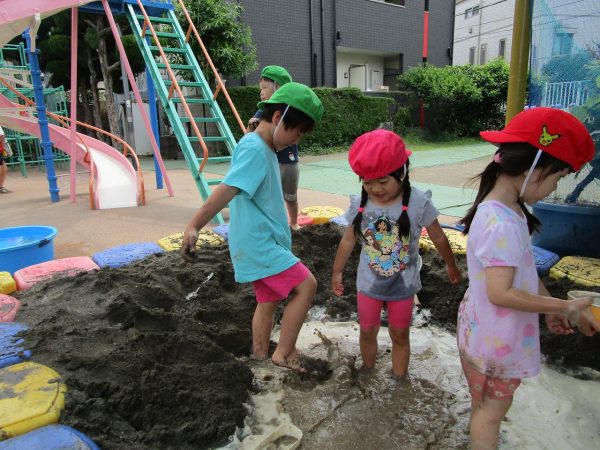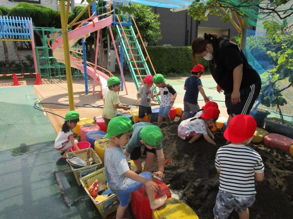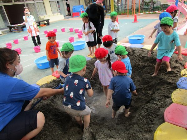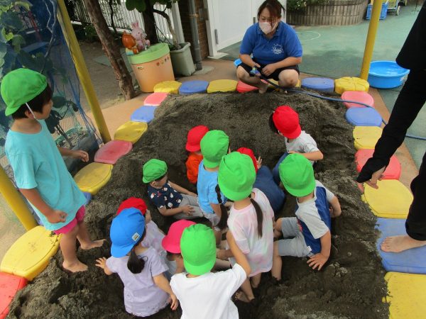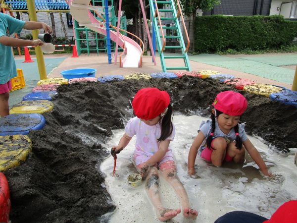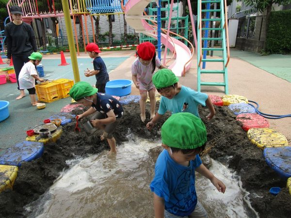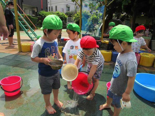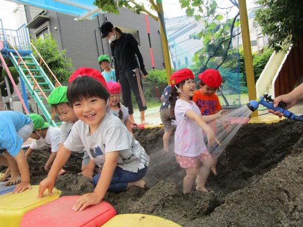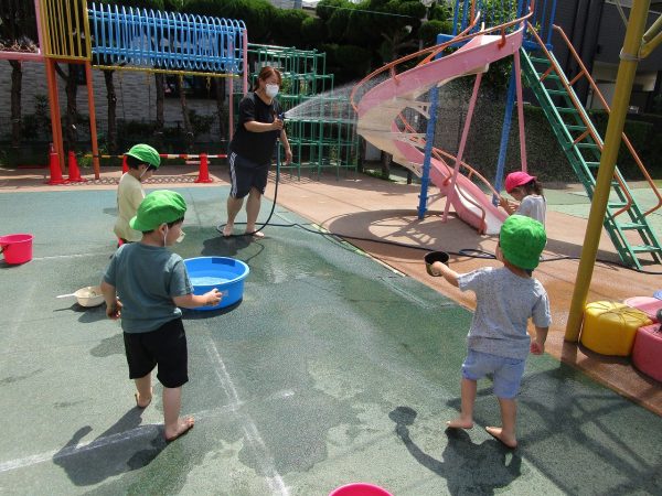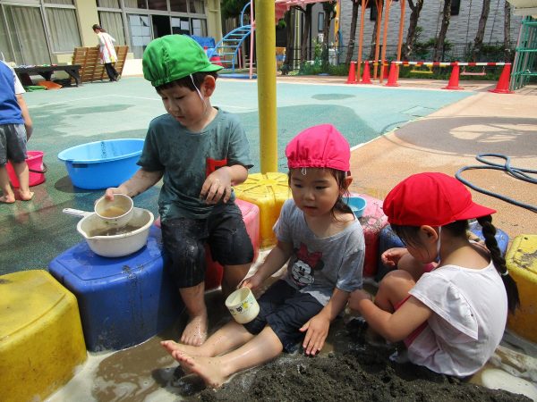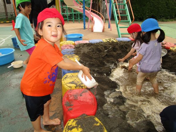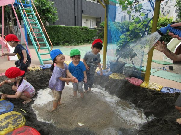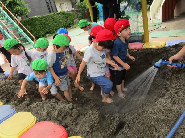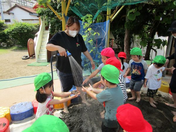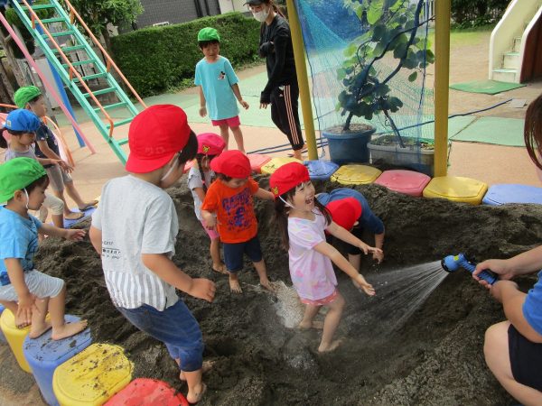 🚿『水遊び⋯』~年少さんもお水遊びをしたよ。暑い日にお水遊びすると、気持ちいいね! その後 お砂場に入って、バシャバシャ・ビシャビシャ⋯、泥だらけー‼