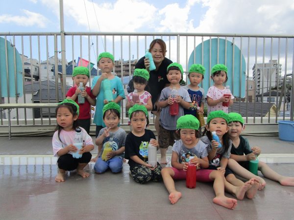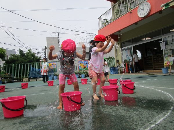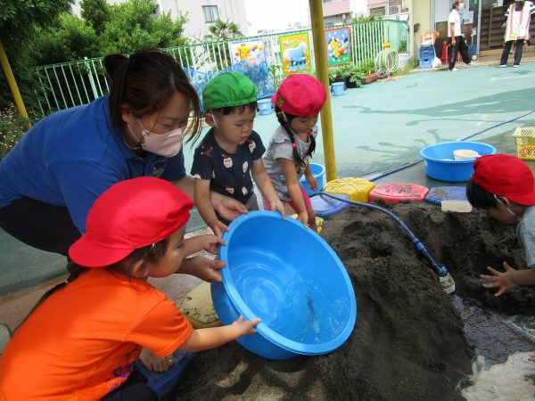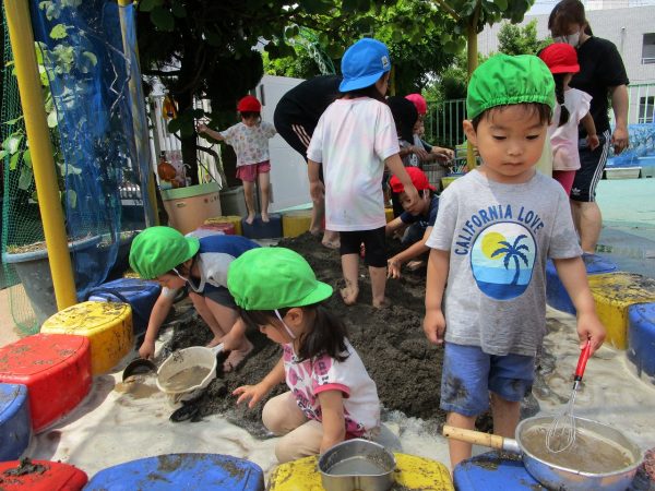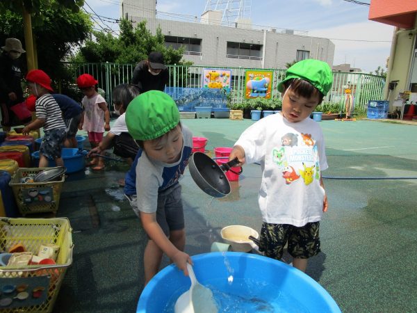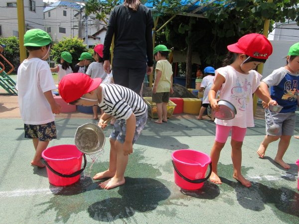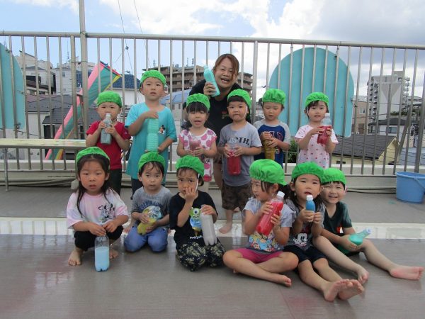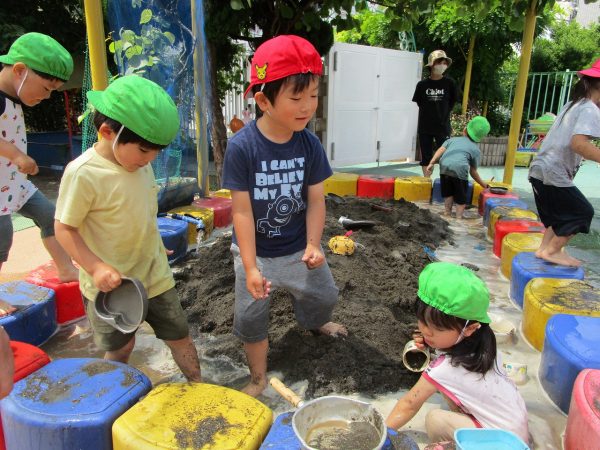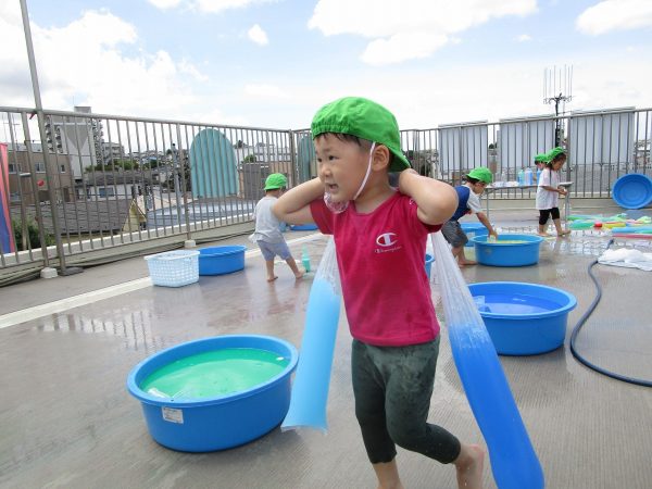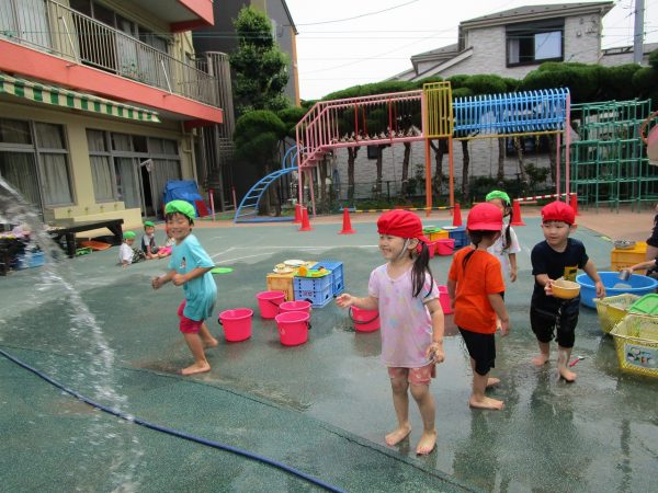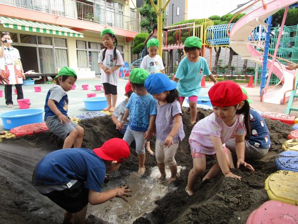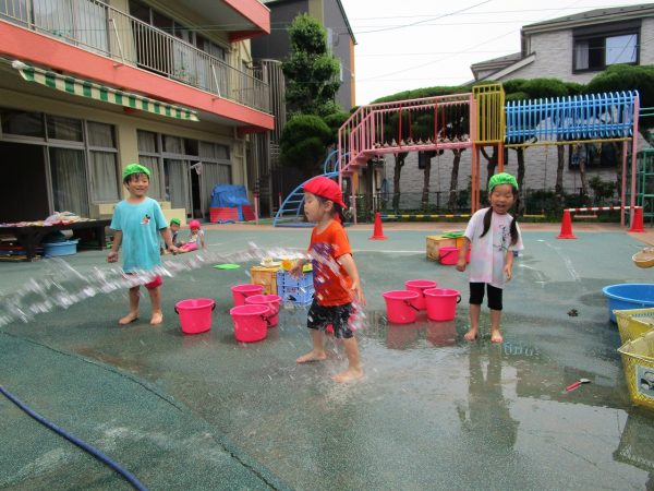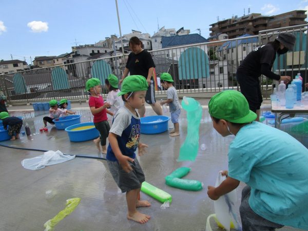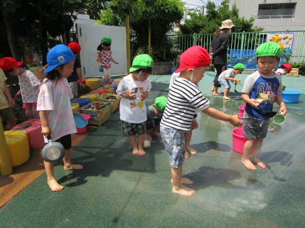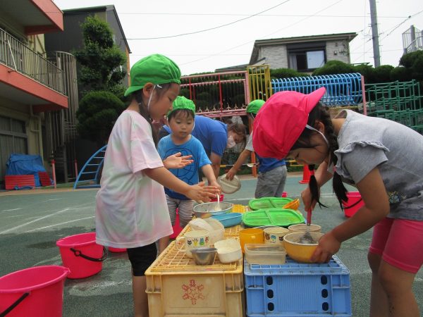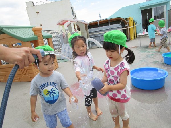 🚿『水遊び⋯』~年少さんもお水遊びをしたよ。暑い日にお水遊びすると、気持ちいいね! その後 お砂場に入って、バシャバシャ・ビシャビシャ⋯、泥だらけー‼