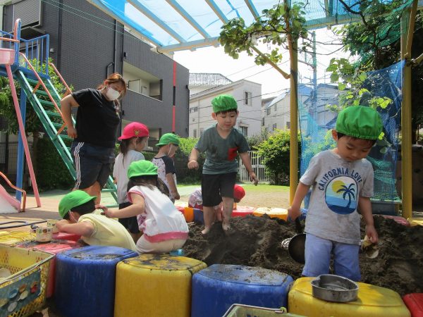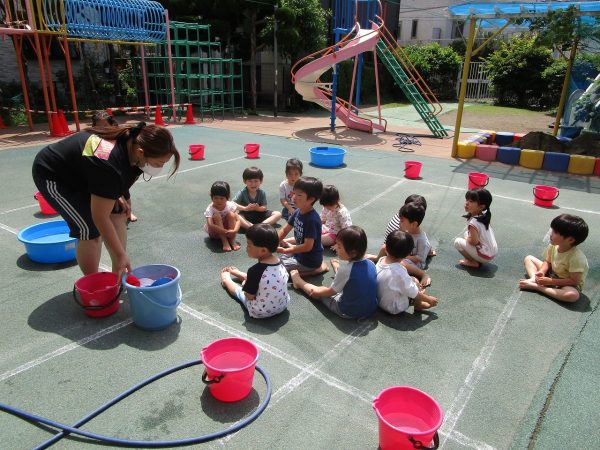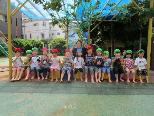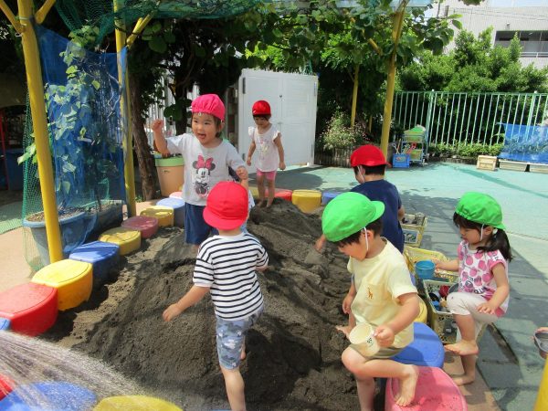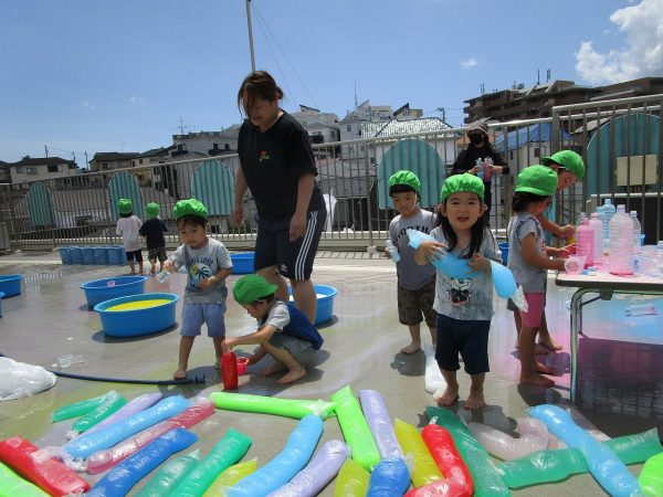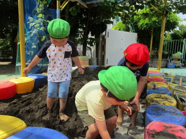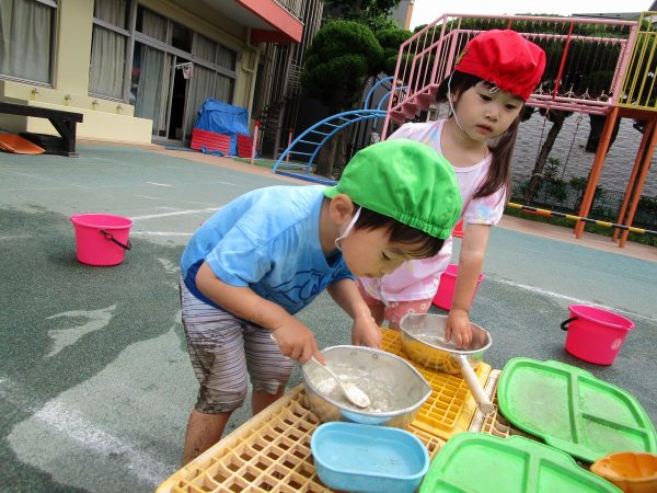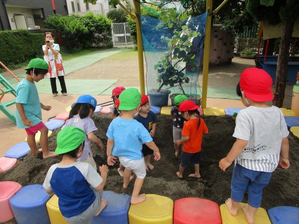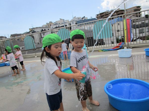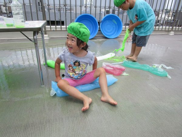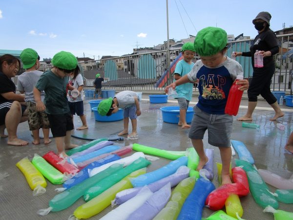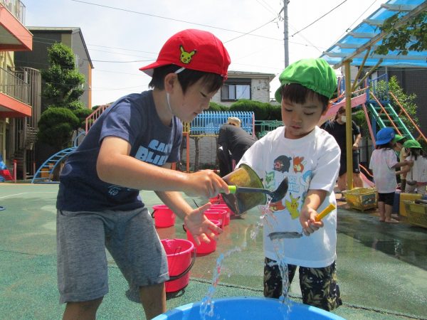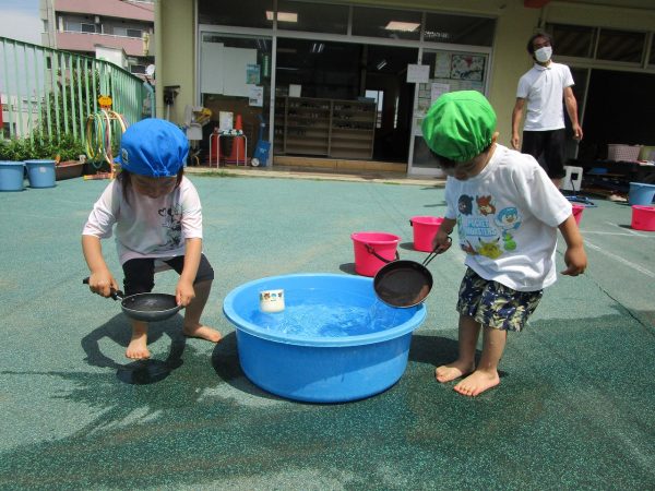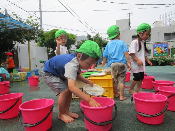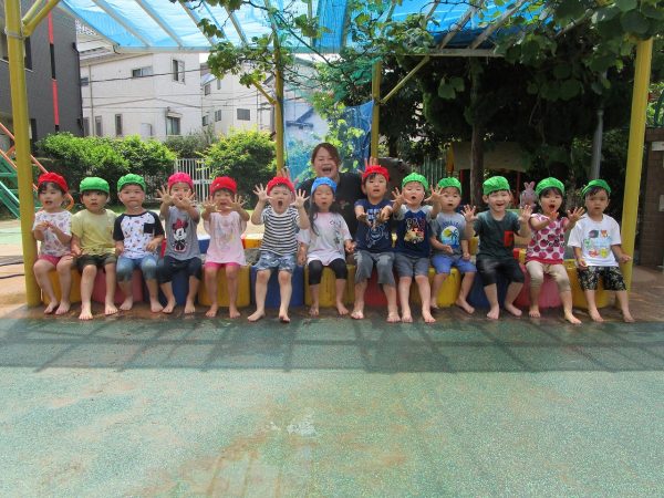 🚿『水遊び⋯』~年少さんもお水遊びをしたよ。暑い日にお水遊びすると、気持ちいいね! その後 お砂場に入って、バシャバシャ・ビシャビシャ⋯、泥だらけー‼