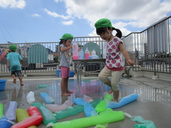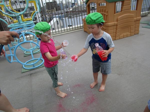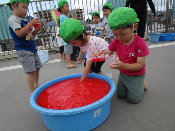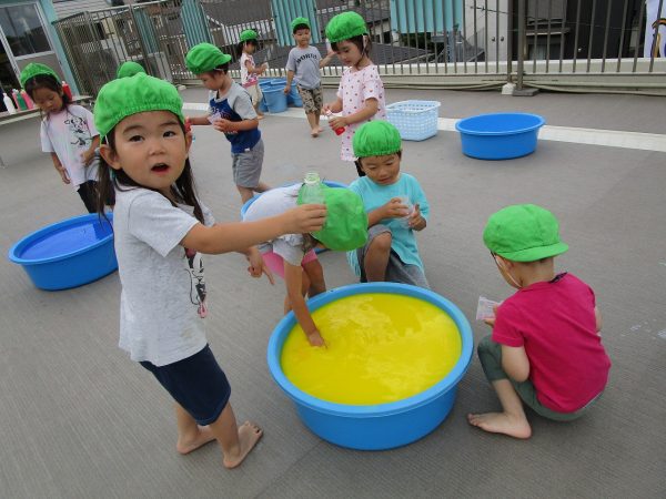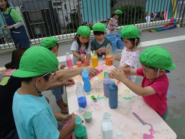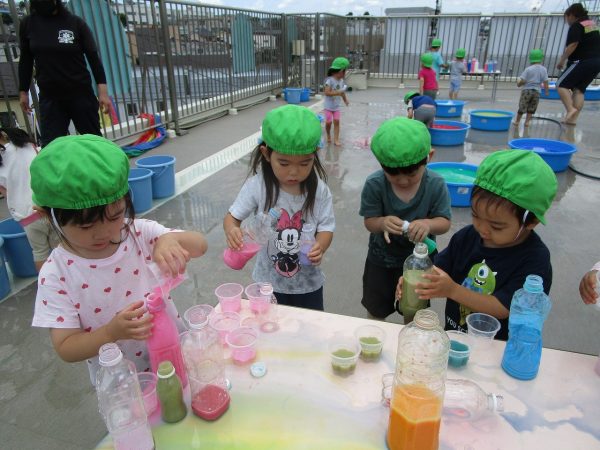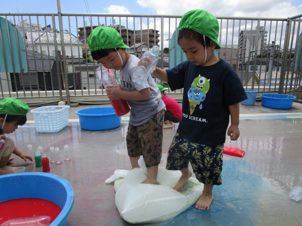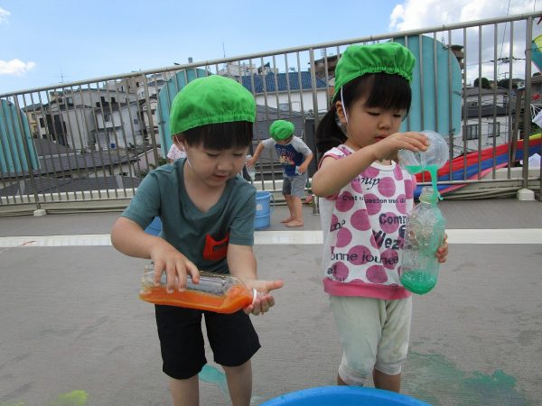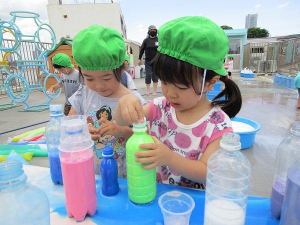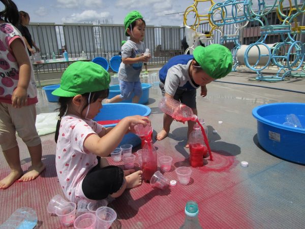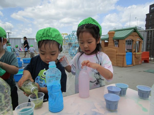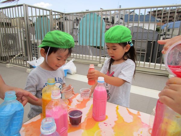 😉『色水遊び』~ペットボトルに入れてジュースを作ったり、色を混ぜて混色を楽しんだり、色水が入ったビニール袋でも遊んだよ。いっぱい遊んで、楽しかったね!