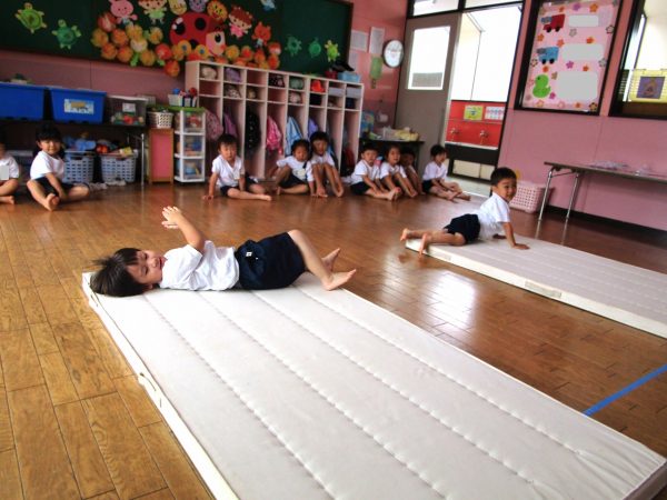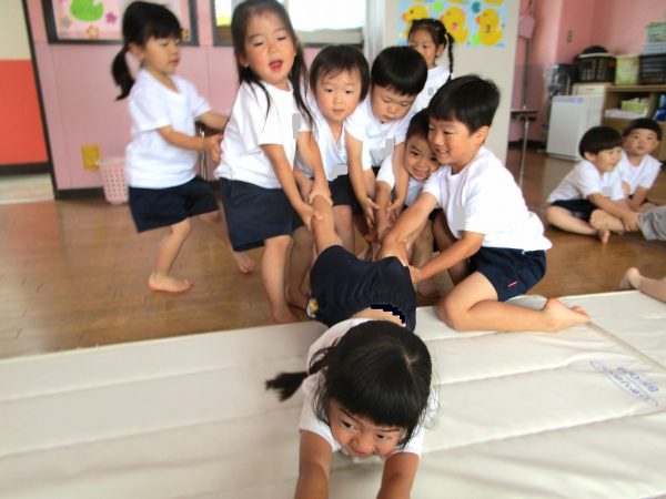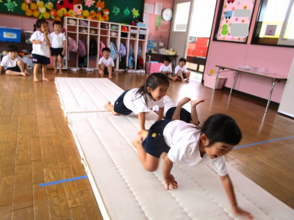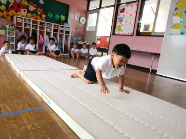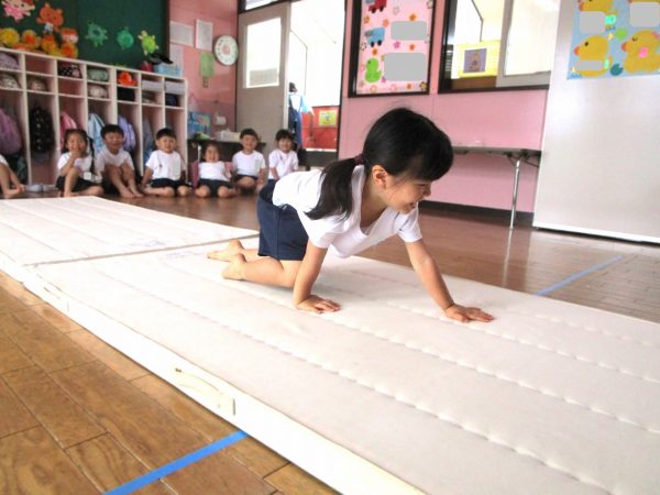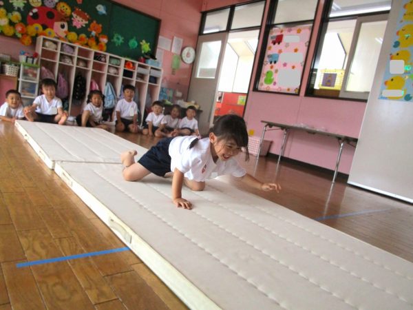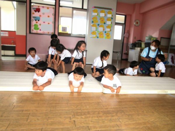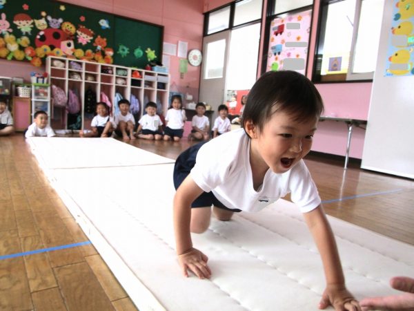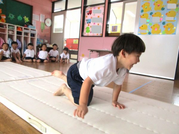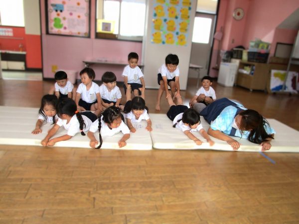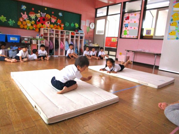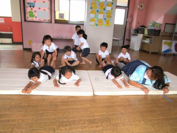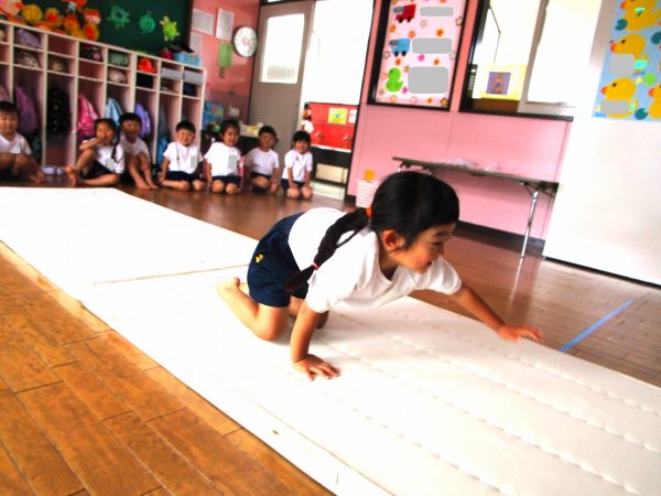 😃『マット遊び』~マットの上をグルグル・ゴロゴロ⋯目が回る~、四つん這いになって⋯「ワオー!」。❝大根ぬき❞、引き抜かれないように頑張ってー‼
