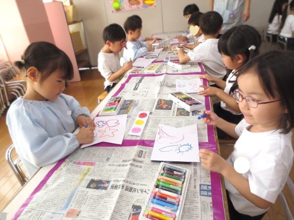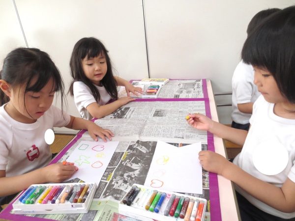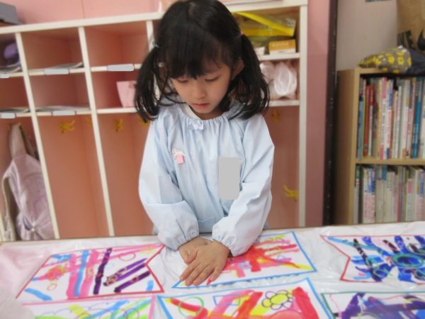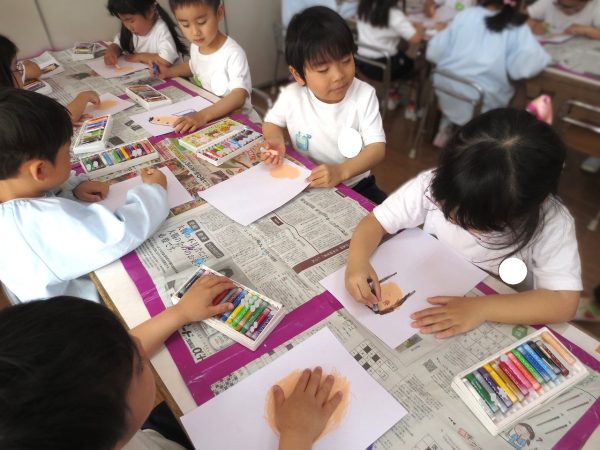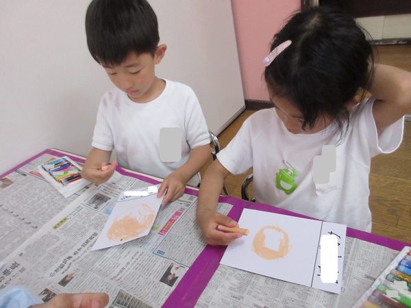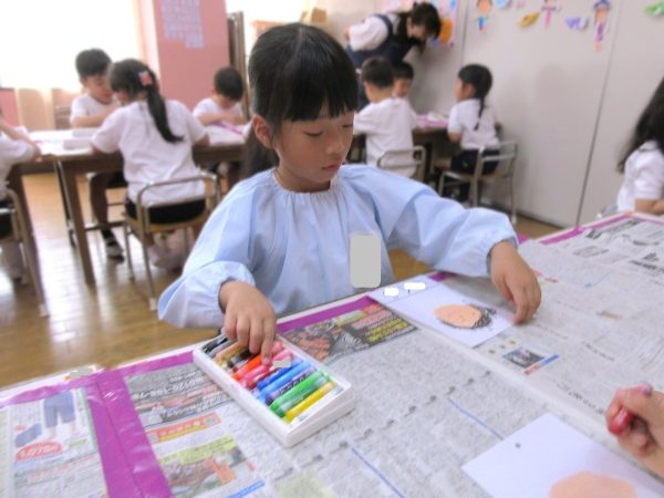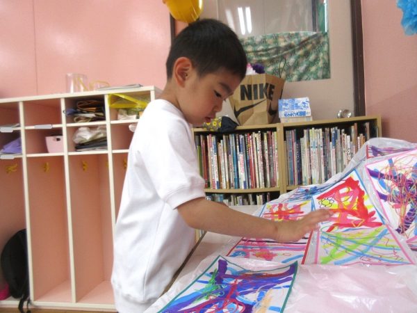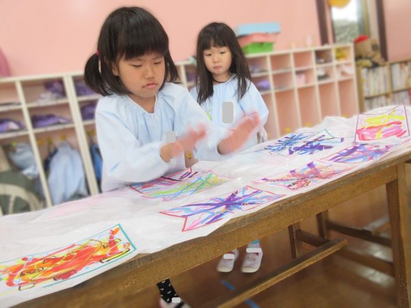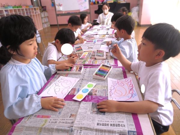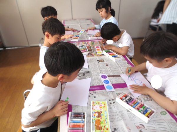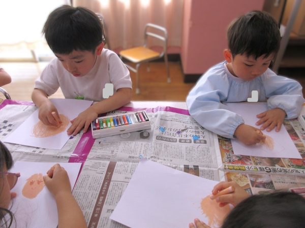 🎏『こいのぼり製作』(はじき絵)~クラスで大きなこいのぼりを作ることにしたよ。ウロコの形の台紙にクレヨンで、ぐるぐる線や星やハートの形などを描いたんだ! その上に絵の具で線を描き入れたら、あ~ら不思議!? クレヨンで描いたものが浮かび上がったよ‼