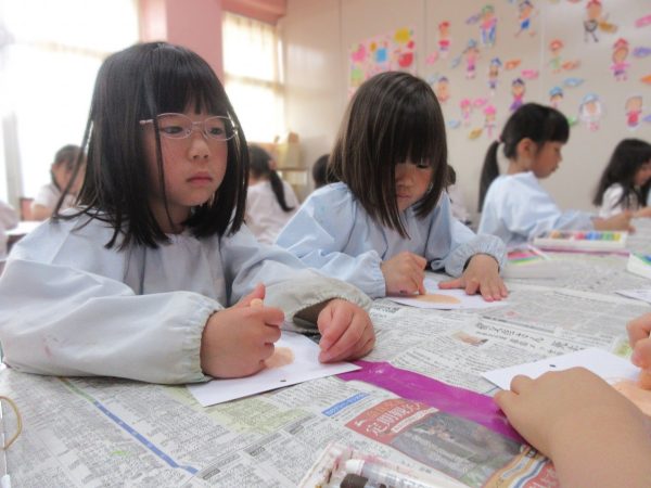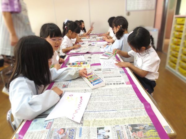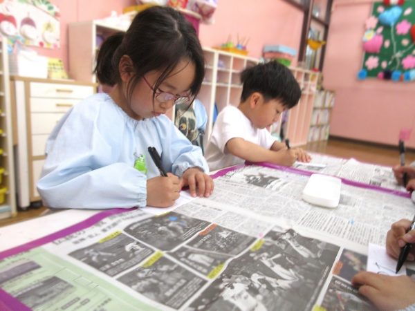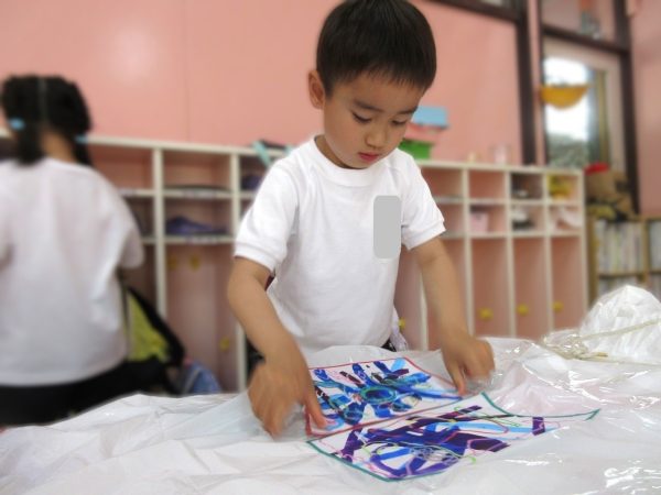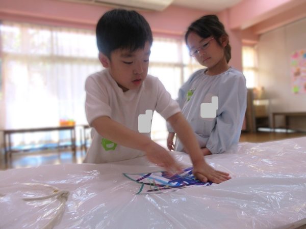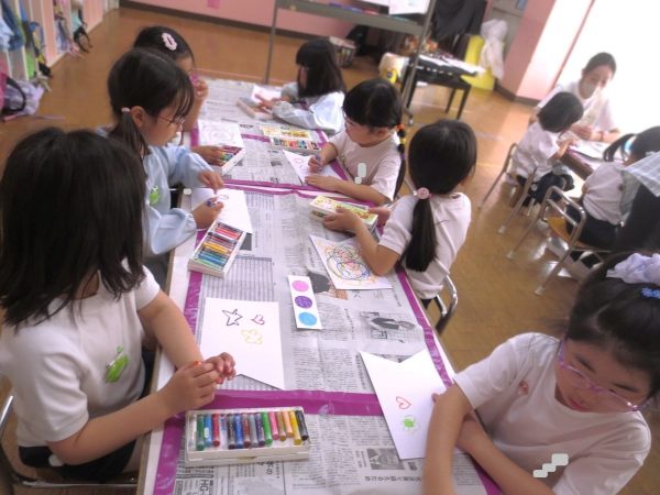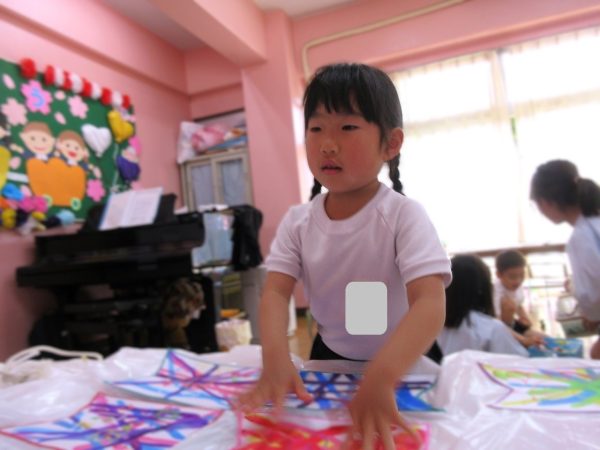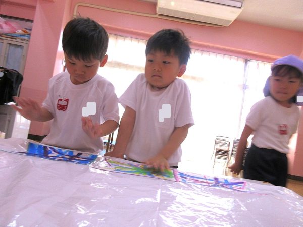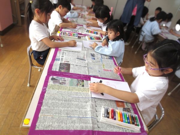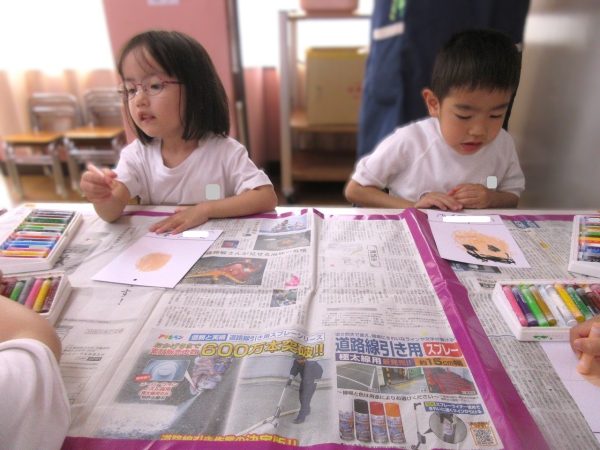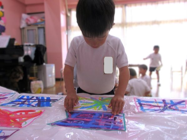🎏『こいのぼり製作』(はじき絵)~クラスで大きなこいのぼりを作ることにしたよ。ウロコの形の台紙にクレヨンで、ぐるぐる線や星やハートの形などを描いたんだ! その上に絵の具で線を描き入れたら、あ~ら不思議!? クレヨンで描いたものが浮かび上がったよ‼