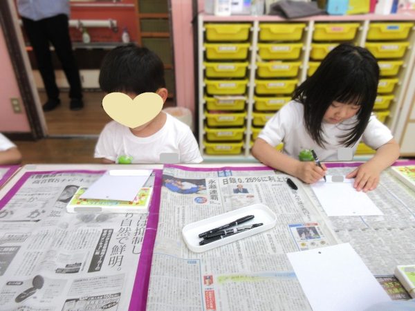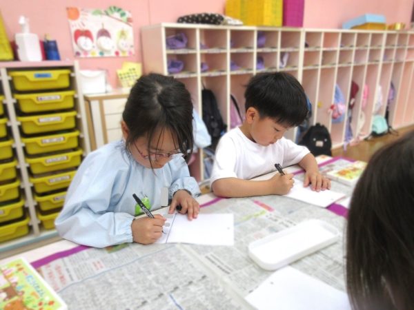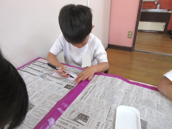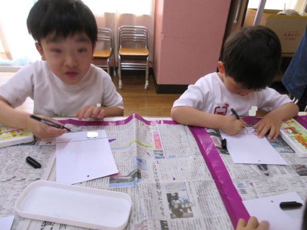 📝『お当番カード』~今度は自分のお当番カードを作ったよ。ペンで名前を書き、クレヨンで自分を描いたんだ!