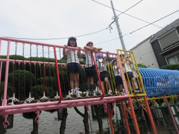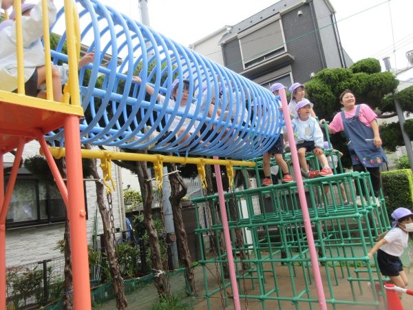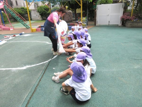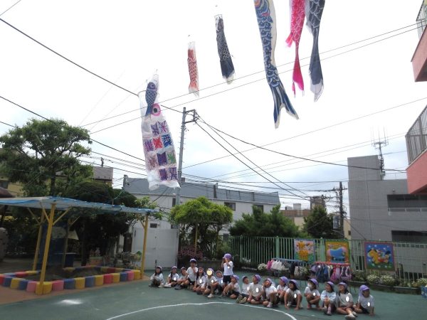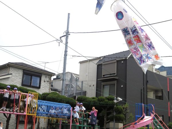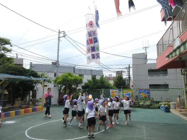 😮『こいのぼりを⋯』~大きなこいのぼりができ上がったので、空に泳がせようと園庭に出たよ。「高~く、高~く 上がれ―‼」
