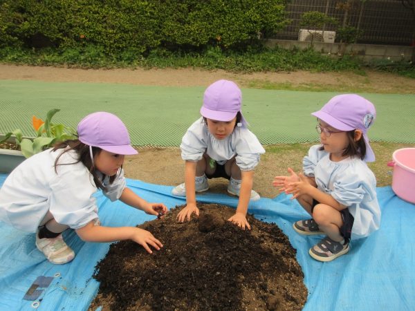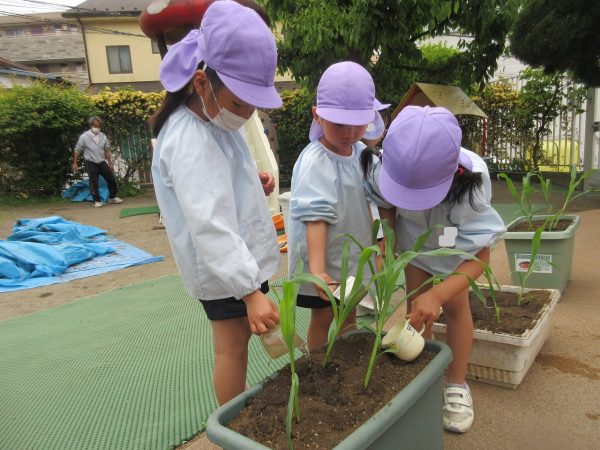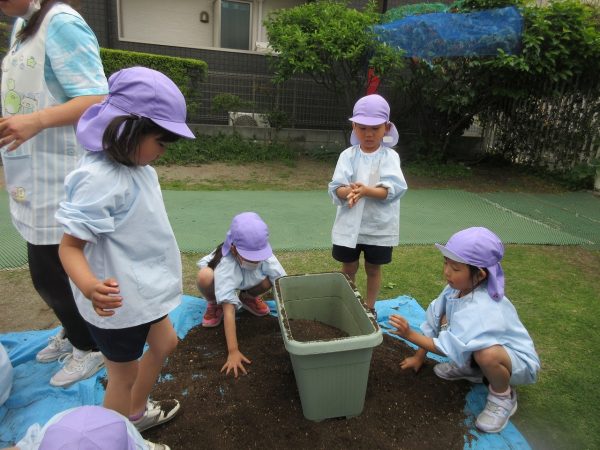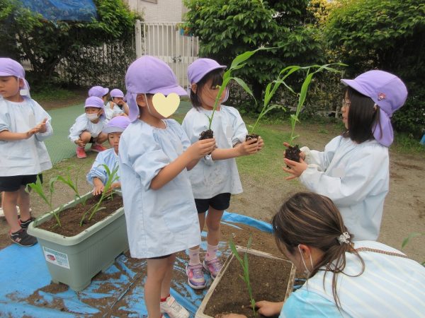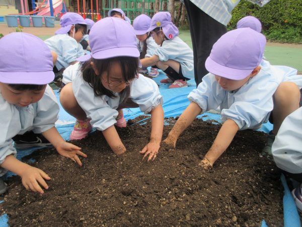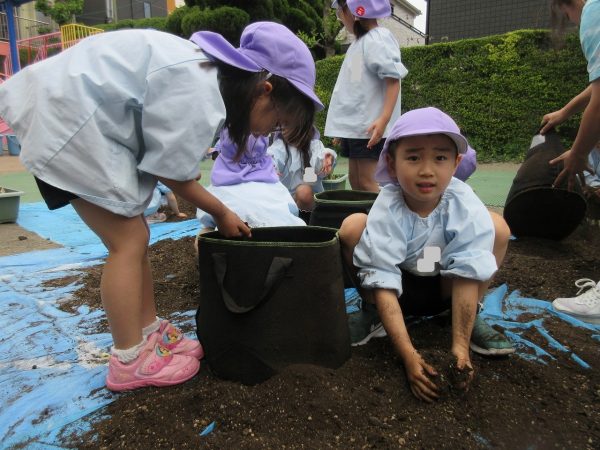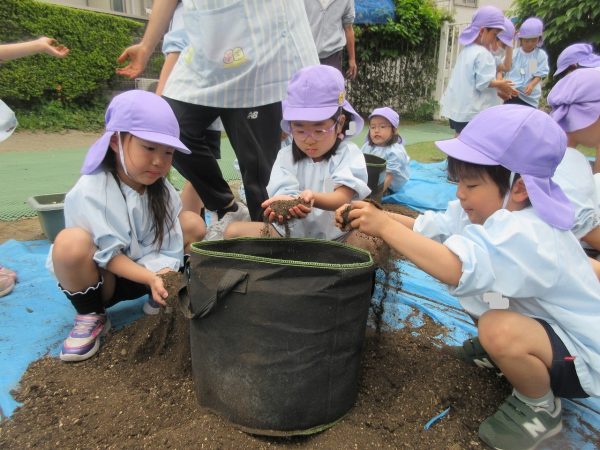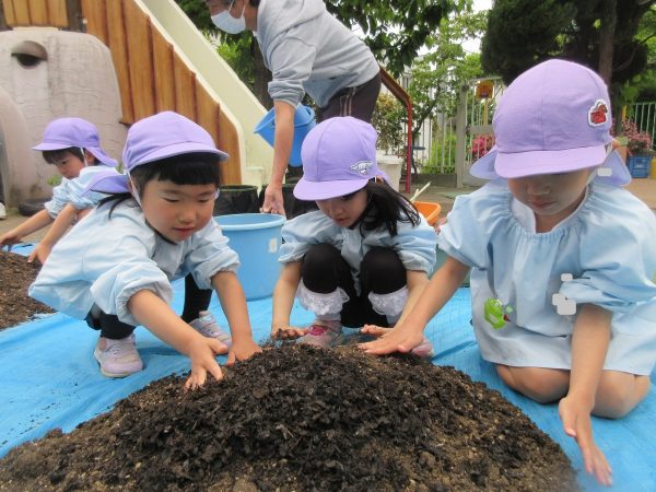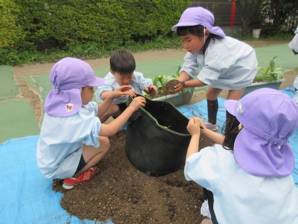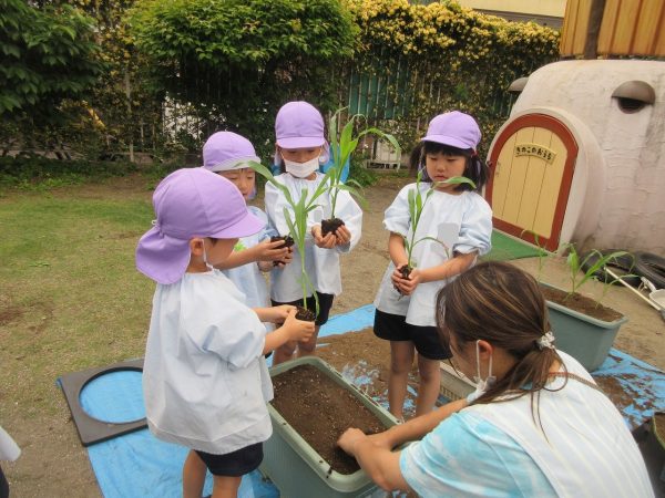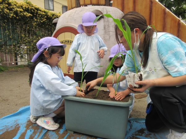 🌽『苗を植えるよ⋯』🥔~みんなで話し合って、トウモロコシとジャガイモを育てることにしたよ。まずは土作り! 腐葉土を混ぜてからよ~くかき混ぜて、プランターに移したら苗を植えるんだ。苗を優しく植えてあげたら、水やりもして⋯ 「大きく、大きく 育ちますように‼」