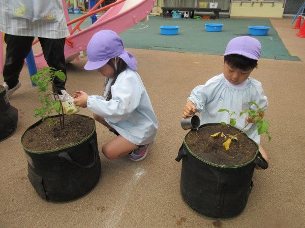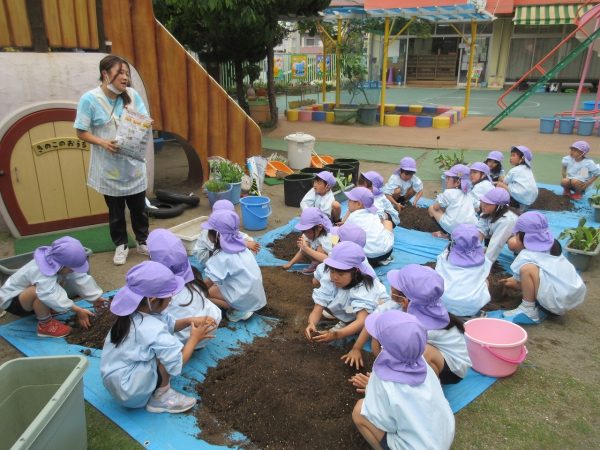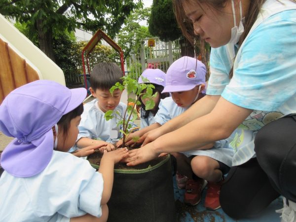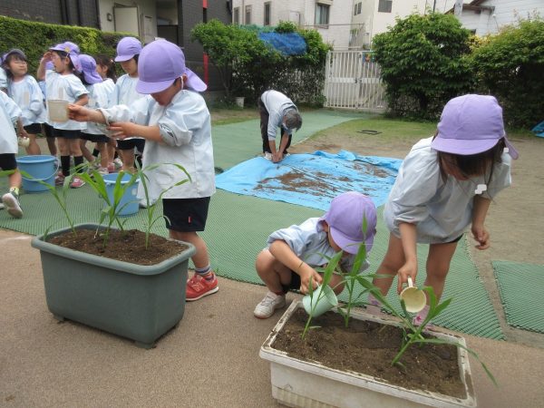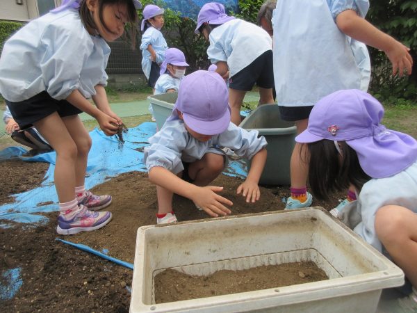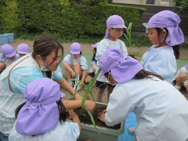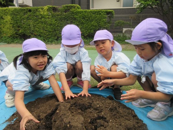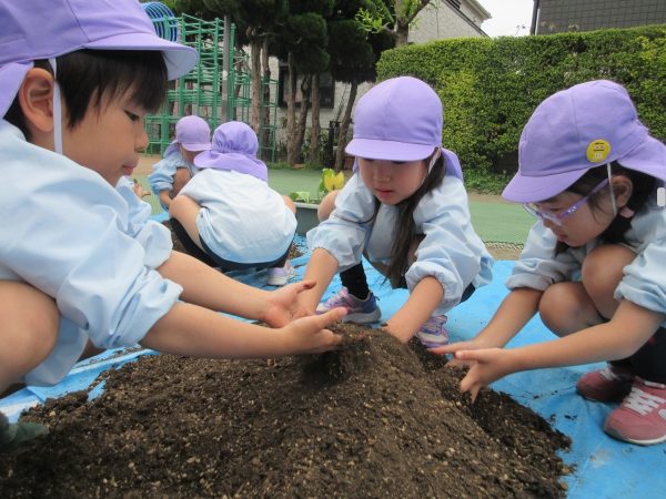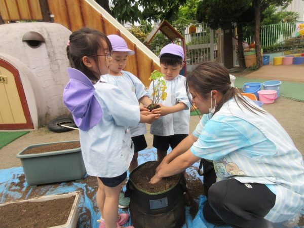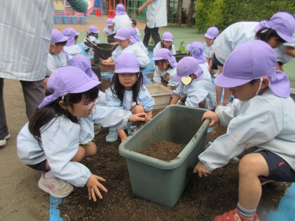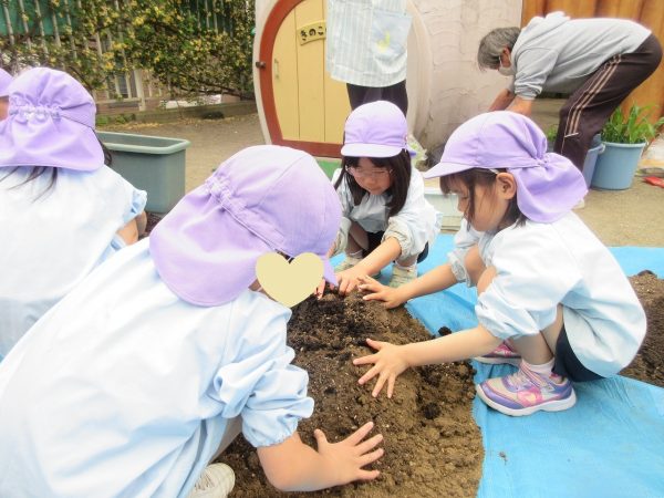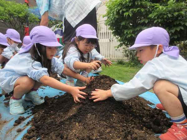 🌽『苗を植えるよ⋯』🥔~みんなで話し合って、トウモロコシとジャガイモを育てることにしたよ。まずは土作り! 腐葉土を混ぜてからよ~くかき混ぜて、プランターに移したら苗を植えるんだ。苗を優しく植えてあげたら、水やりもして⋯ 「大きく、大きく 育ちますように‼」