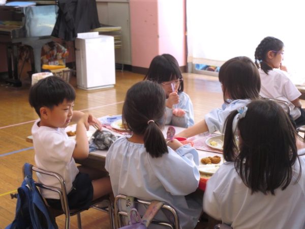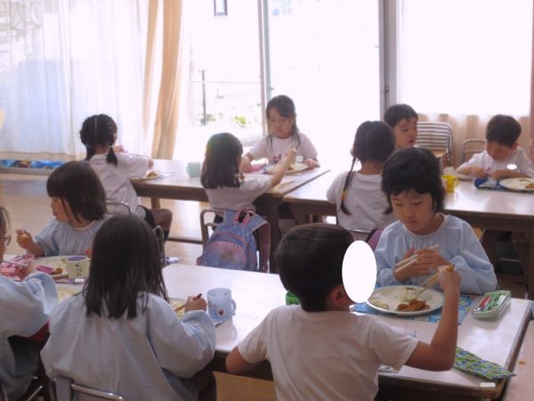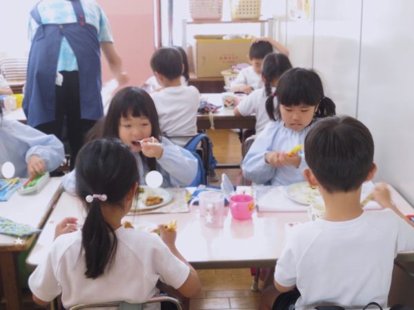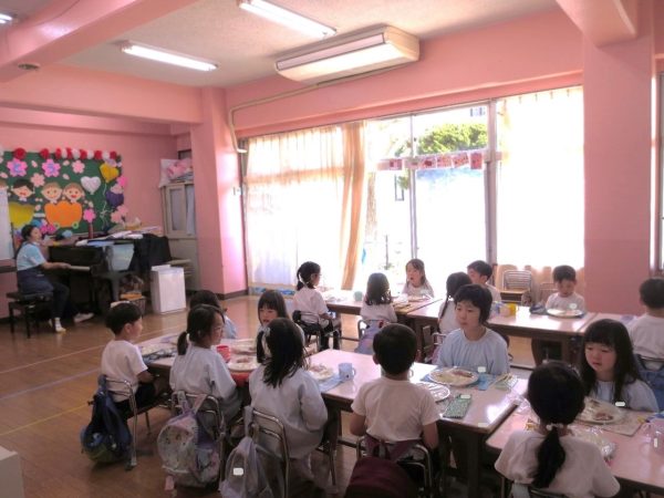 🥢『給食始め』~今日から幼稚園の給食。「おいしいね!」、「いっぱい おかわりするんだ‼」