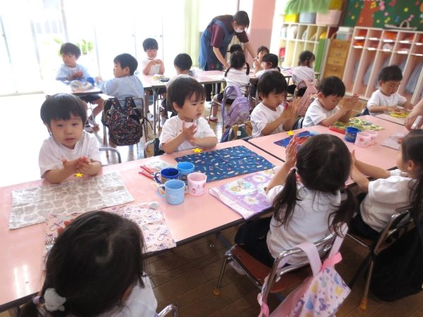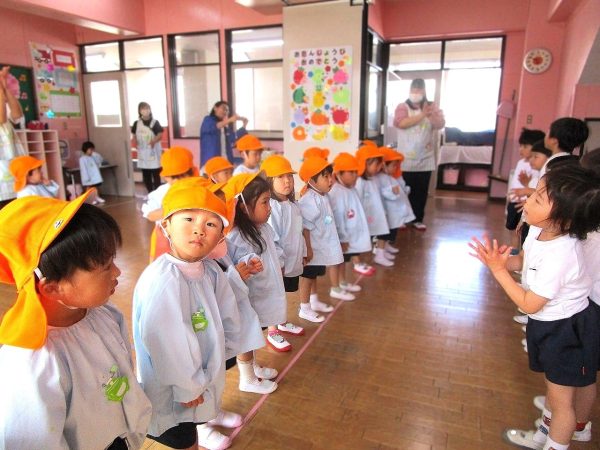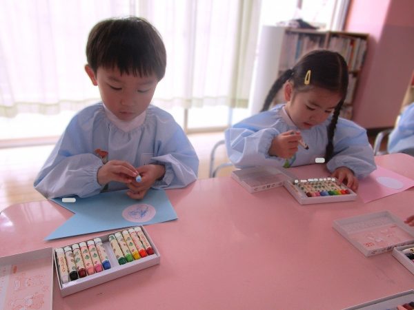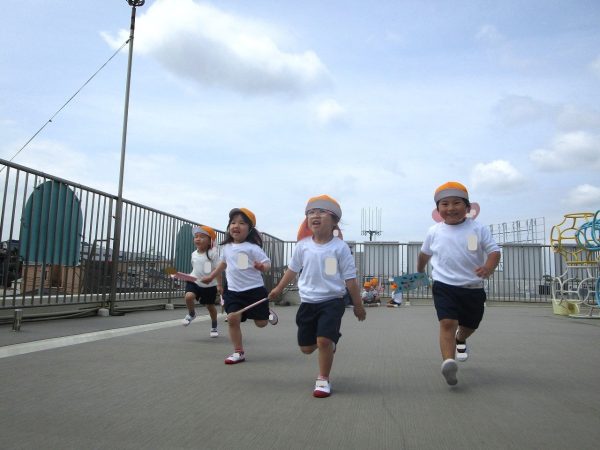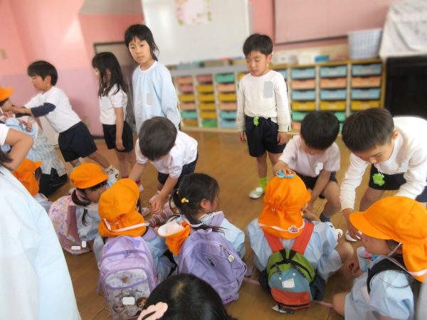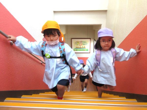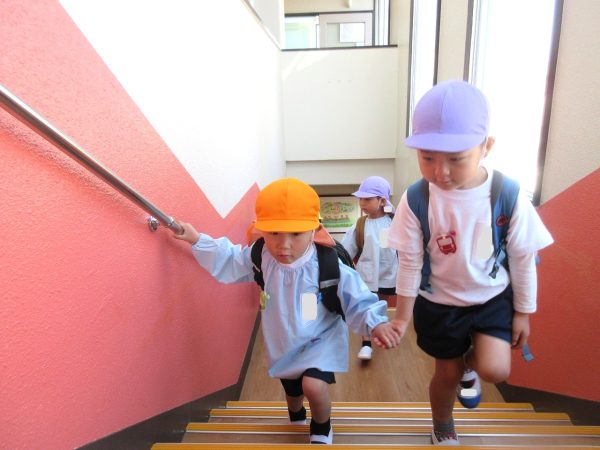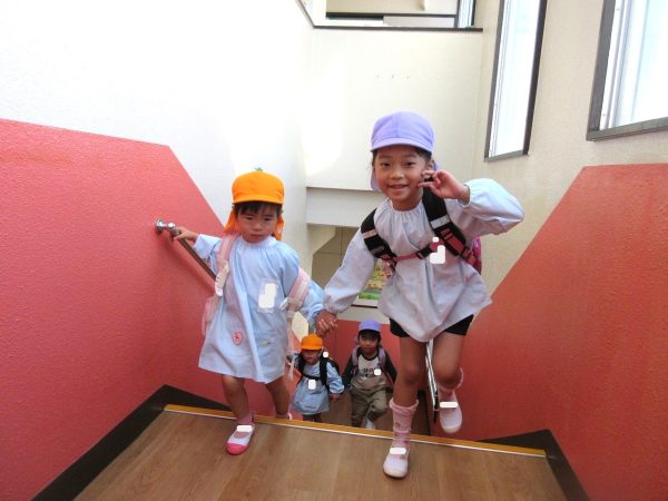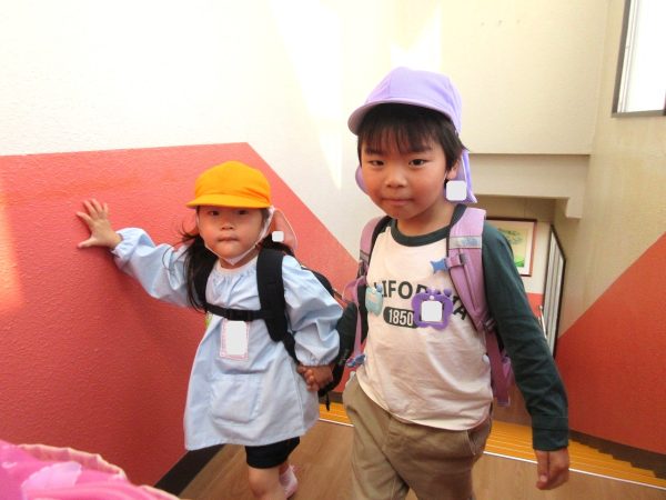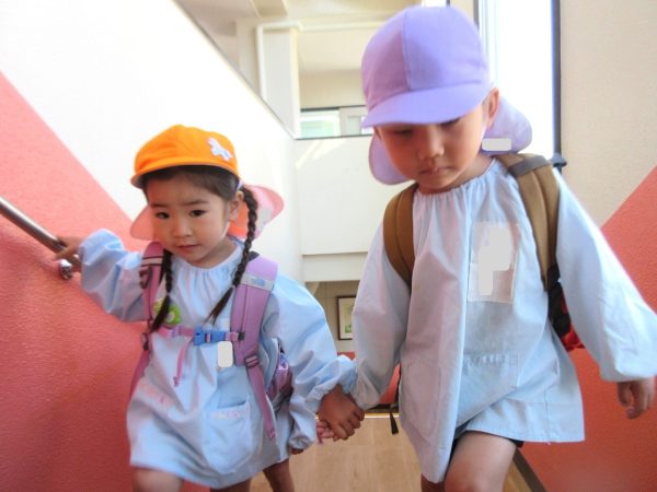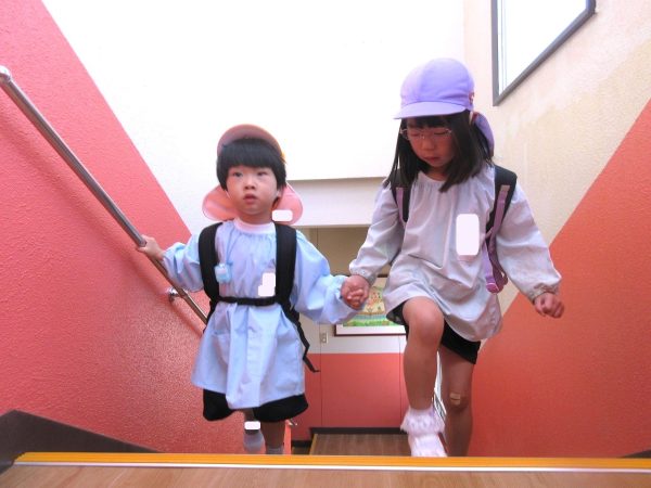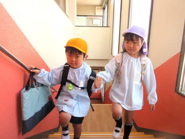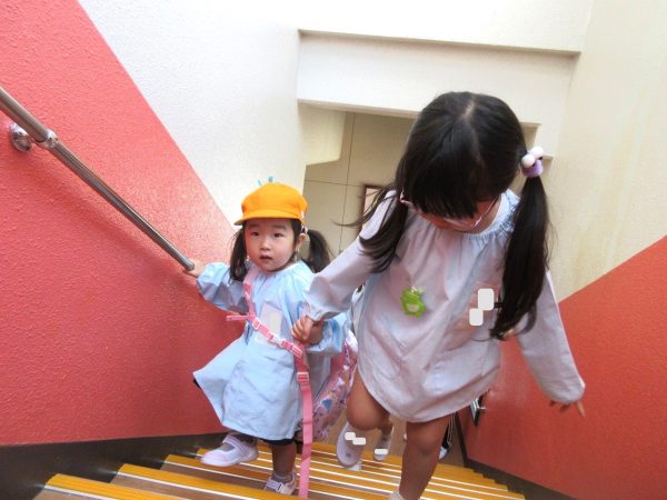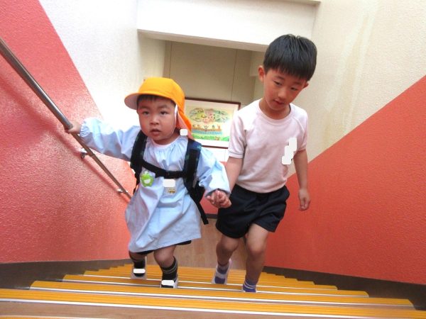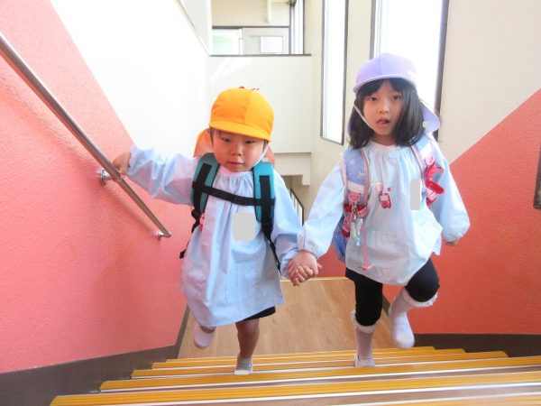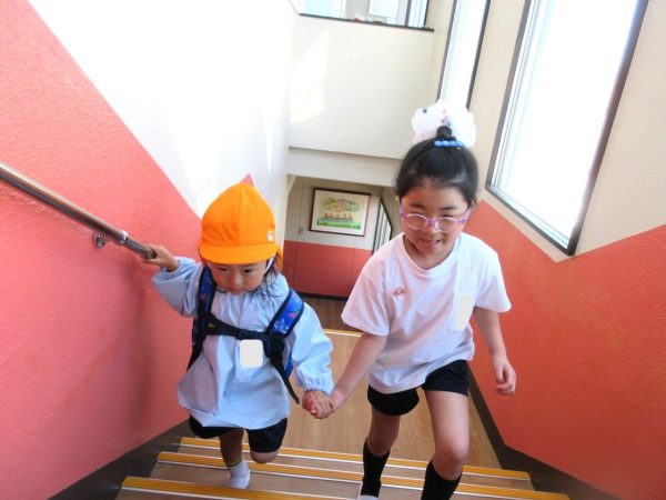 😃『年長さんと⋯』~登園すると年長さんが手をつないでくれて、お部屋まで連れていってくれるんだ。「年長のお兄さん、お姉さん、とっても優しいね!」