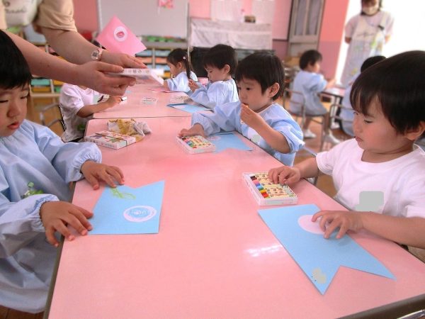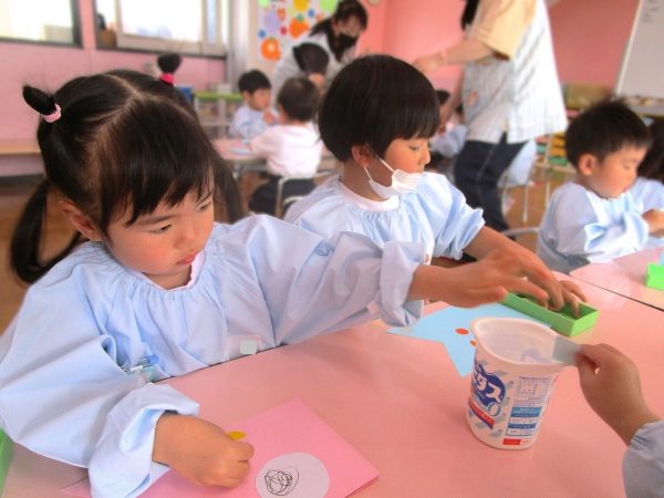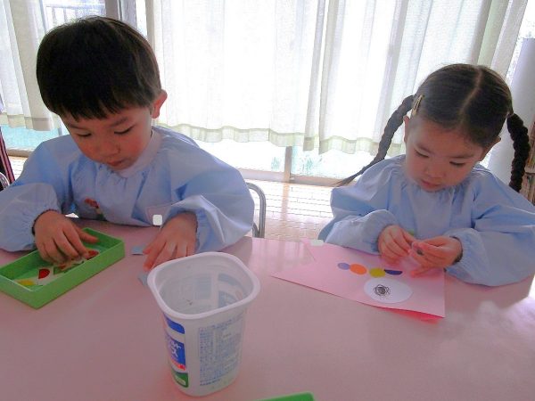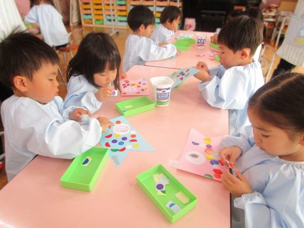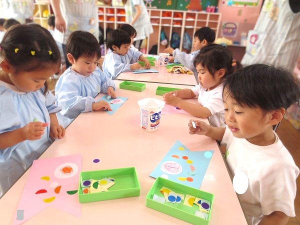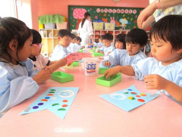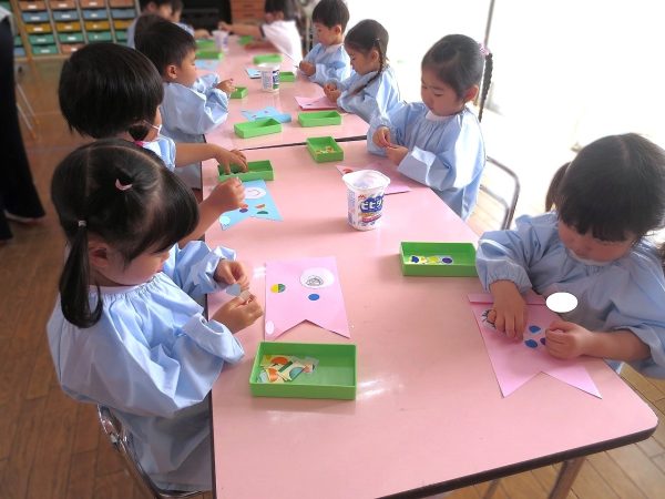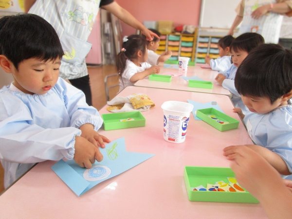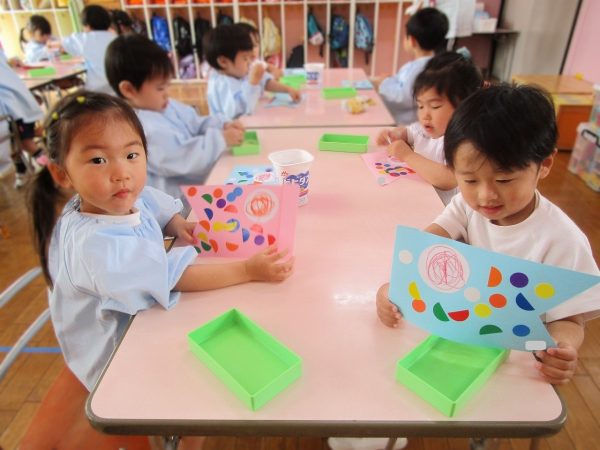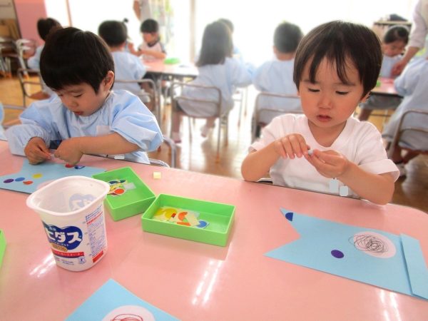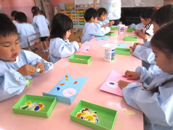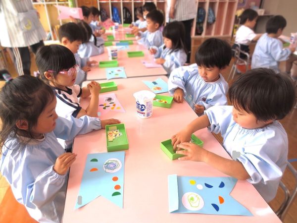 🎏『こいのぼり製作』~こいのぼりの目をクレヨンで描いて、体の部分にはいろんな色のシールを貼って、模様をつけたよ。すてきなこいのぼりができたでしょ!