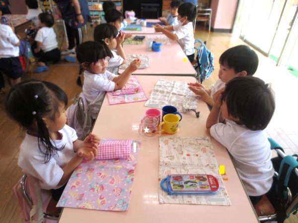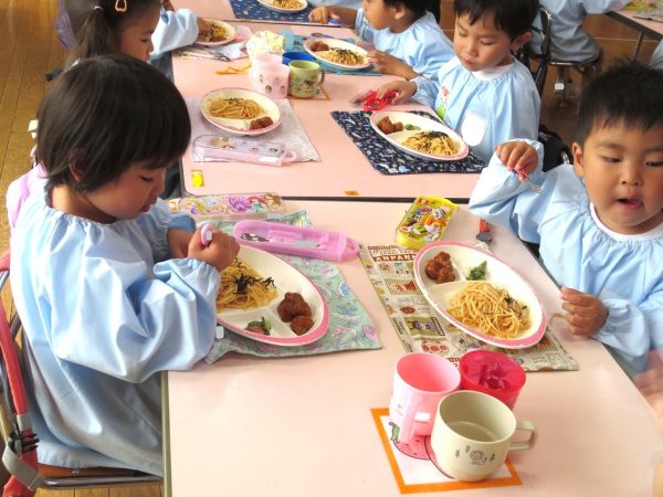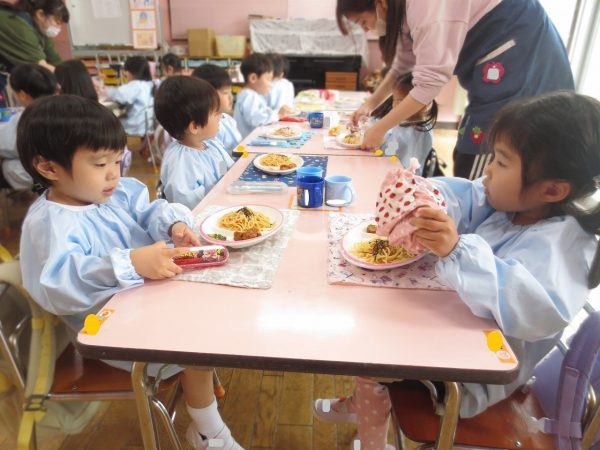 🥄『給食始め』~今日から幼稚園の給食。ご飯もの、パン・サンドウィッチ、麺類といろんなメニューがあって、楽しみだね!