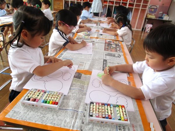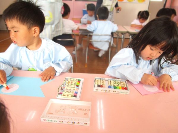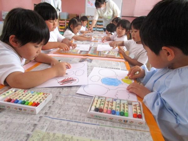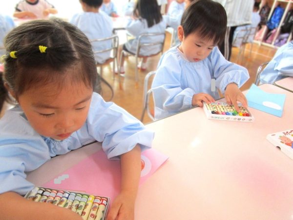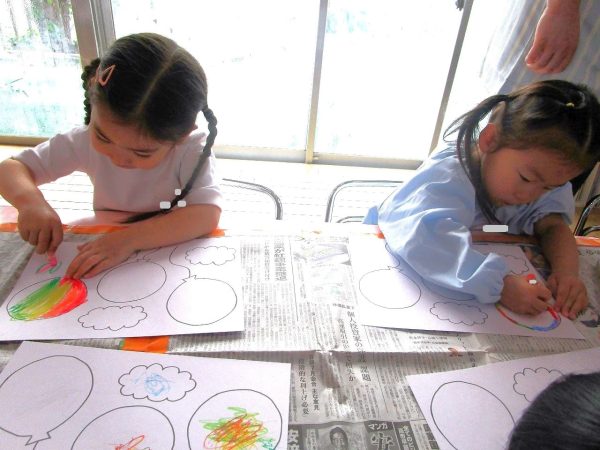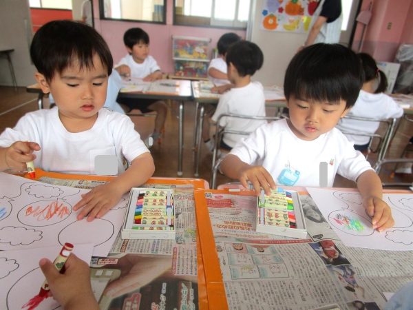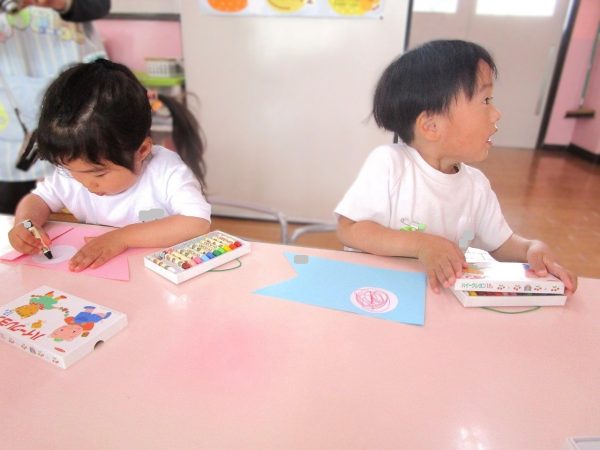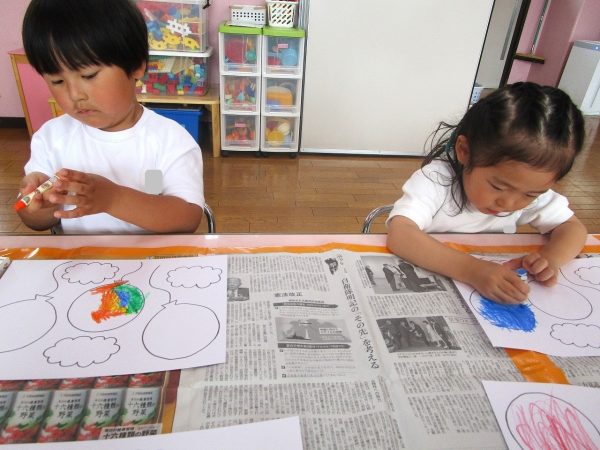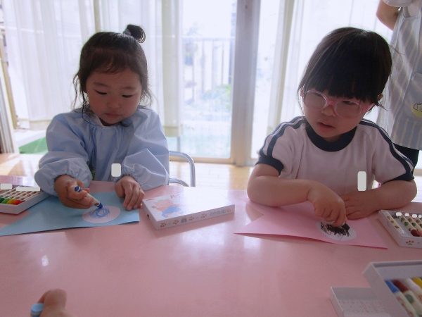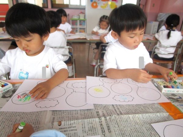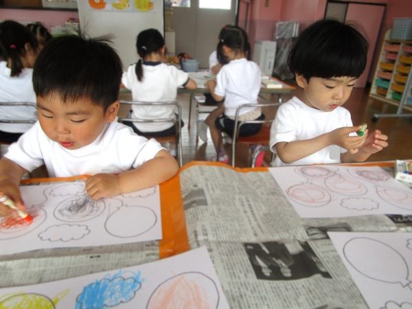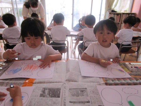 🖍️『クレヨンで⋯』~台紙に描かれている「フウセンと雲」に、好きな色のクレヨンでぬり絵をしたよ。たくさん色を塗って、楽しかったんだ!