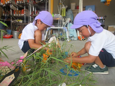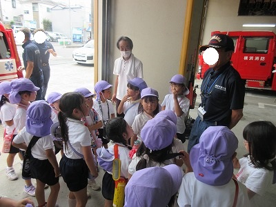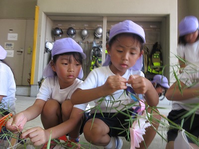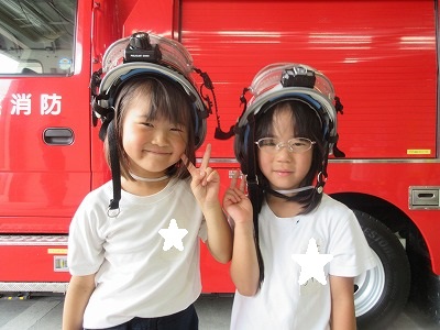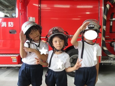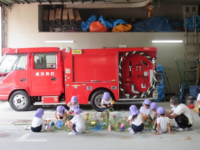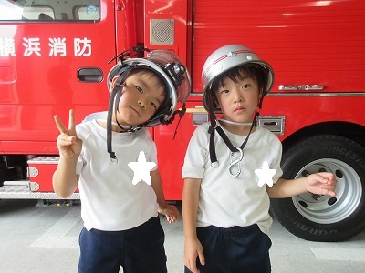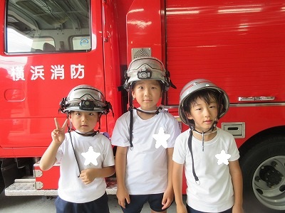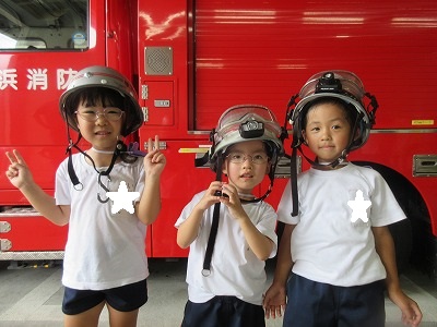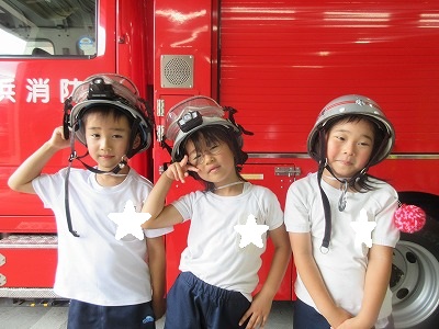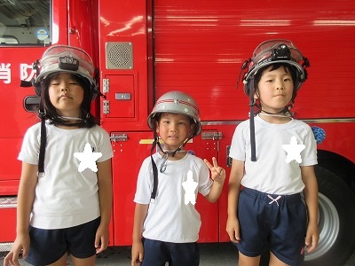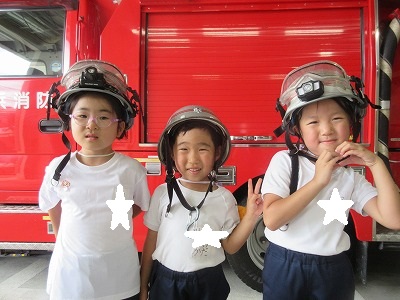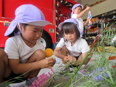 七夕さまの日を迎える前に無病息災・健やかな成長を祈る願いを自分達だけに向けるのではなく、火事になった時、大けがや病気で倒れた時、いつもかけつけてくれる消防署の皆様方に「無事にお仕事ができますように」の願いと「いつもありがとうございます」の感謝の気持ちを七夕飾りと一緒に毎年、年長組さんが届けに行ってくれます。 飾りは3学年みんなで作り、消防士さんと一緒に飾りつけをします。「いつもありがとうございます💕」 消防車の前で、ヘルメット着用させて頂いてパチリ。