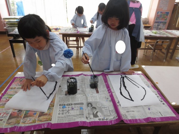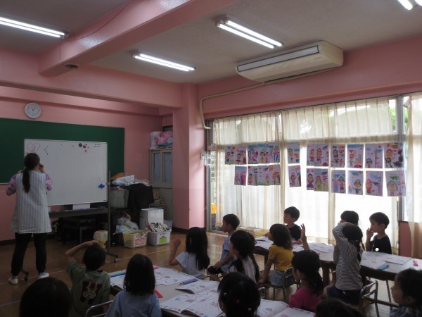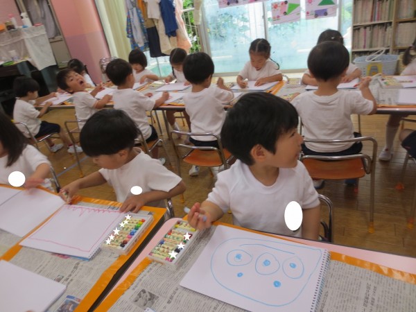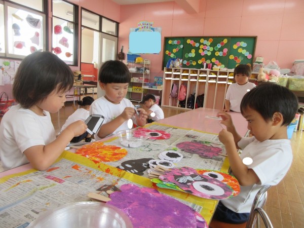 年長組さんでは今までにない素材を使って描画活動をしますが、プラスチックボードと油性ペンを使って、思い思いの線を描き、その中に色を塗りこみながらステンドグラスをつくりました。形の中を周りの色と同じにならないように何色にする…