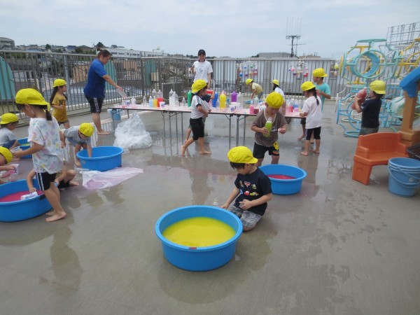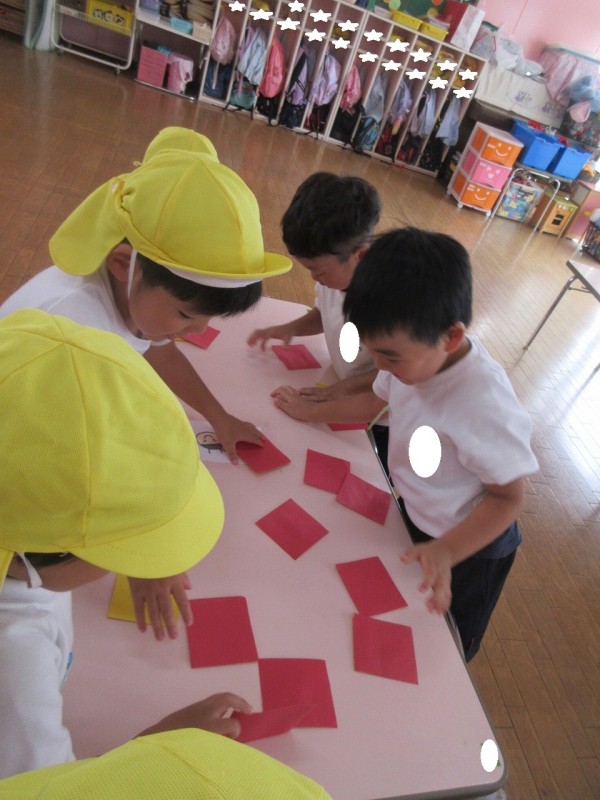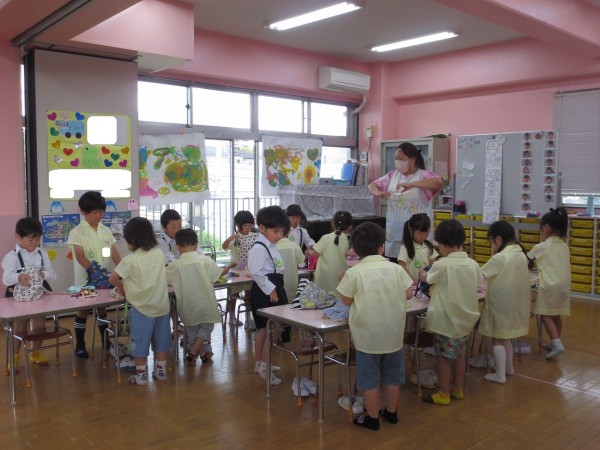 菊組さんでやきそば作りをみんなでしました。毛糸を麺にして、いろいろな具材を色画用紙やフェルト、段ボール紙を切ってつくりました。作ってから自由遊びの中で楽しんできましたが、今日はやきそばやさんごっこをみんなでしました。 や…