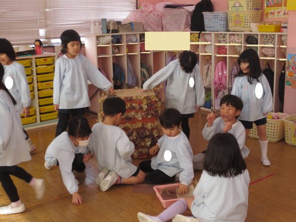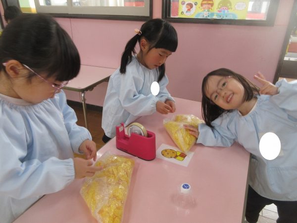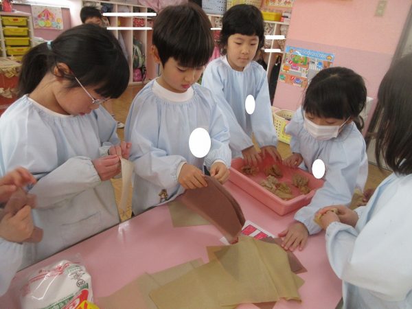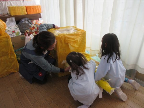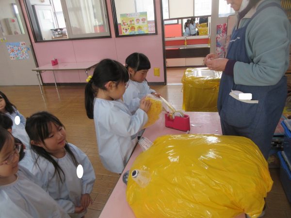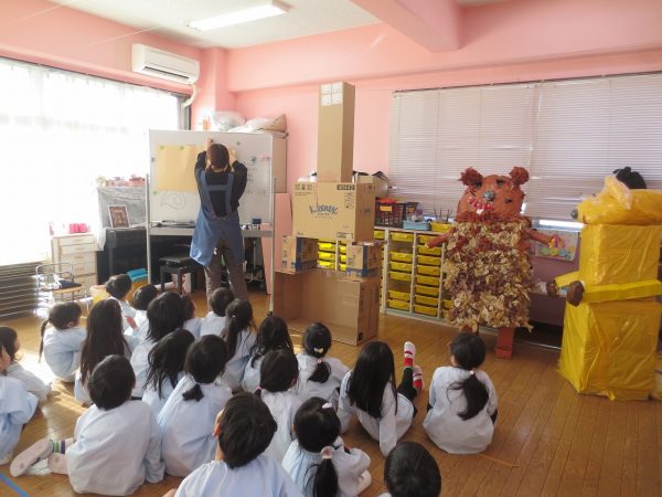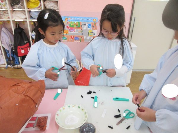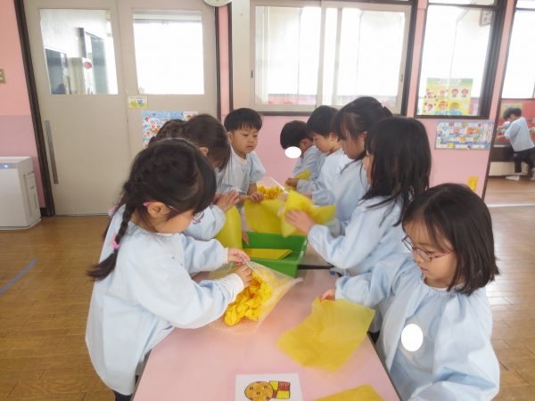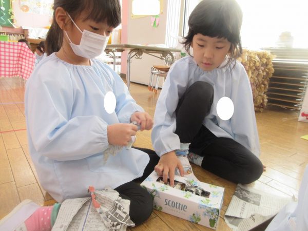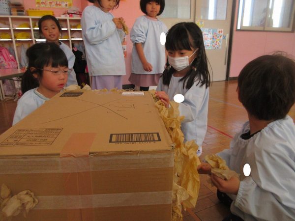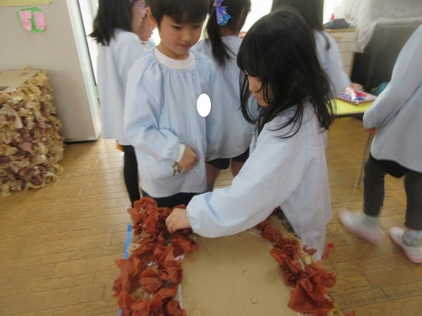 菊組さんの共同製作2日目です。お話「ポカポカホテル」に登場してくるキツネとリスをチームに分かれてつくっています。リスさんの身体は「ふわふわにしたい!」という要望からお花紙をつかいました。キツネさんは「黄色にしたい!」という要望から黄色の鮮やかな色のビニール袋をつかうことになりました。目や耳や鼻、手などなどもお友達と力を合わせてつくりました。