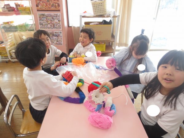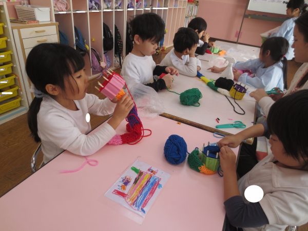 藤組さんは保育参観でマフラーの始まりを保護者の皆様にお手伝いをしていただきました。その後、10日たつかたたないかで、2人の男の子が最初に完成!刺激を受けて次々に完成していく姿に改めてお友達の姿の影響力に驚きました。
