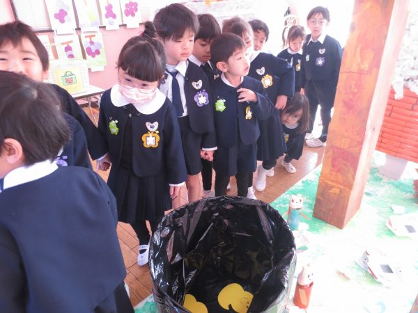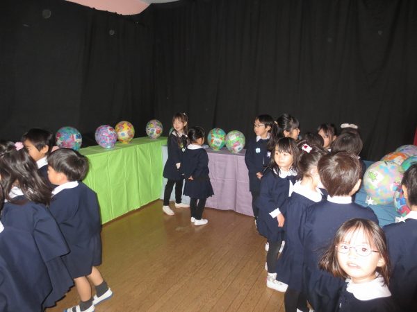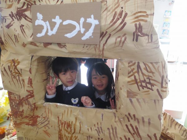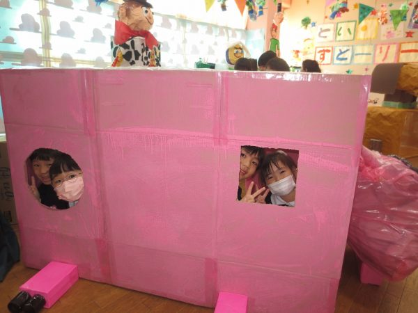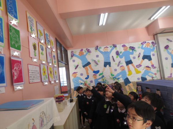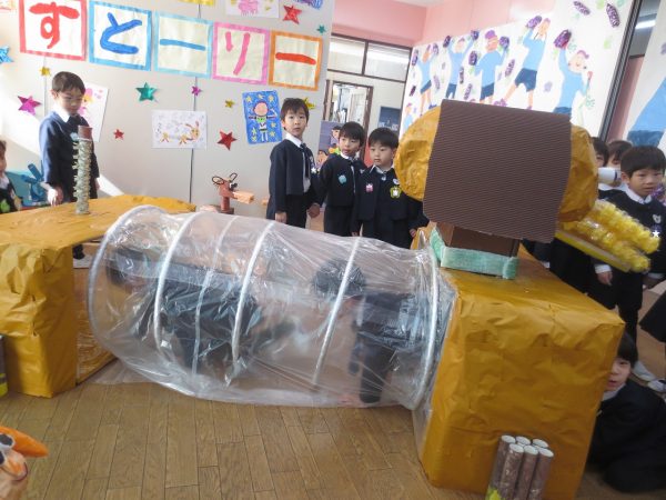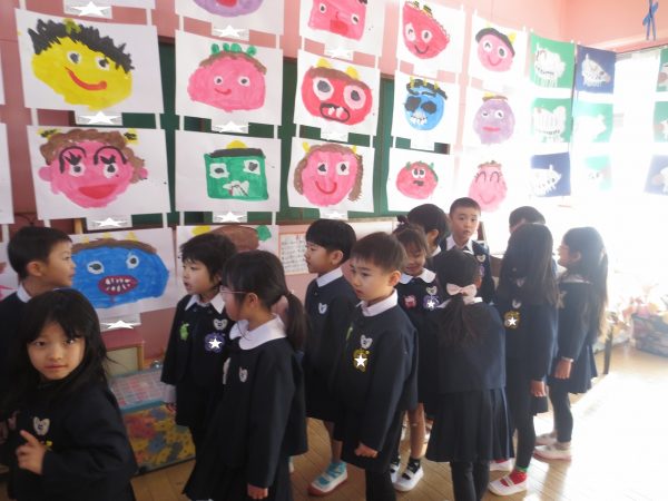 作品展が始まります。最初は子ども達だけで回ります。藤(年長)組さんと菊(年中)組さんとペアになって、小桜(年少)組さんはクラスのみんなと回ります。あこがれの年長組さんのお部屋は共同製作の中にも入れてワクワク。真っ暗なお部屋でランプが光ってドキドキ。年中組さん、年少組さんのお部屋もカワ(・∀・)イイ!!