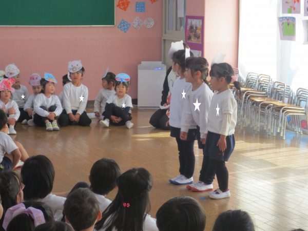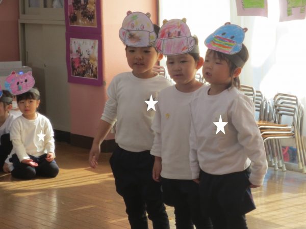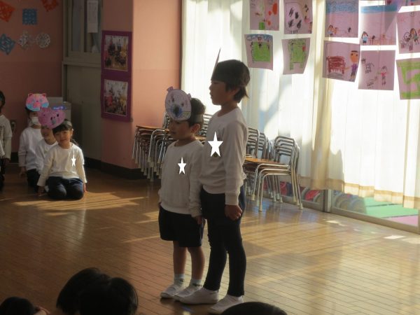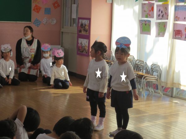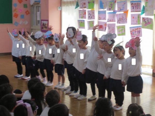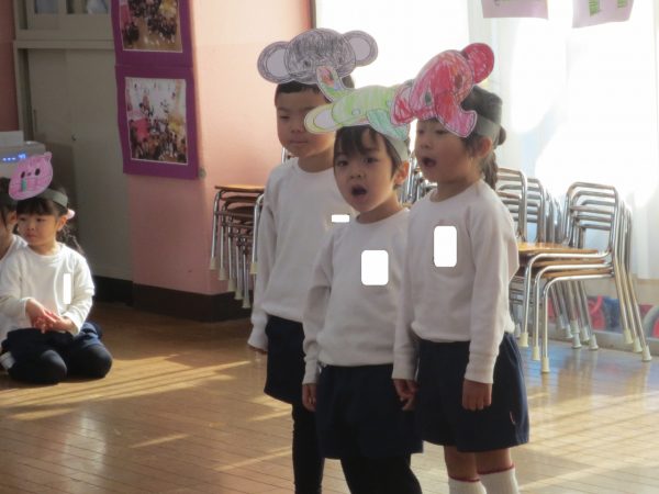 2月28日(金)に2月のお誕生会をしました。その時に小桜組さんが可愛い動物さんになって劇をしてくれました。風邪をひいた動物さん達が各々のマスクをしたお面をかぶって登場してきます。りすさんのマスクは小さいマスク。ツルさんのマスクは細いマスク。ブーちゃんのマスクは丸いマスク。かばさんのマスクは大きいマスク。ゾウさんのマスクは長いマスク。お面も一人一人ぬり絵をしました。