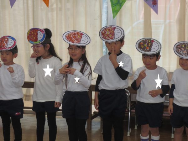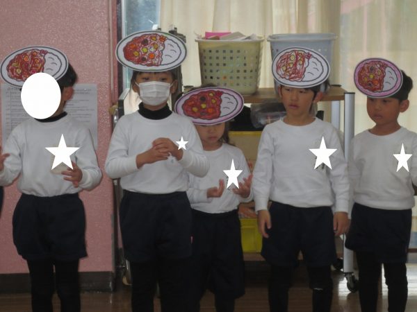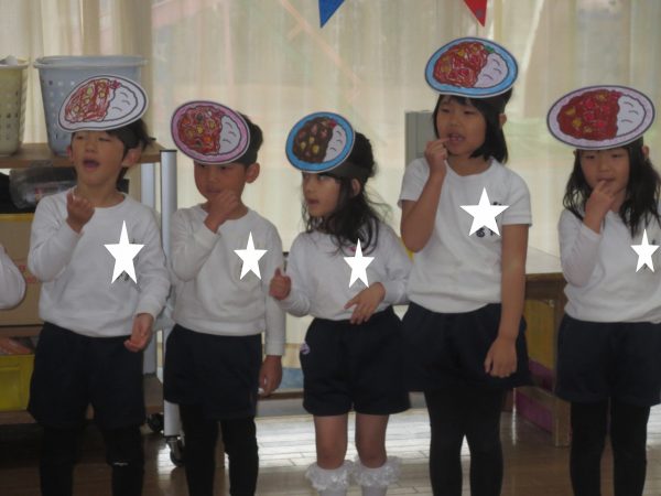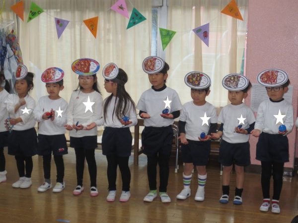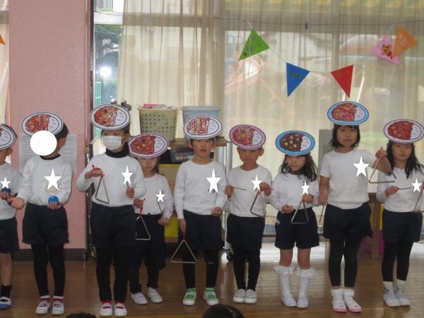 3月入ってすぐに3月の誕生会がありました。菊組さんがタンバリンやすず、カスタネットやトライアングルの楽器をつかって「カレーのうた」の合奏をしました。合奏が終わって、次は歌と手遊びを「にんじん・たまねぎ・じゃがいも・豚肉・お鍋で・炒めて・グツグツ煮ましょ♫~」した後にみんなで「藤組さん、カレーをつくってくれてありがとう」とお礼をいうと「どういたしまして💕」の藤組さんみんなからのごあいさつ。あたたかい気持ちが一つになってホンワカしました。