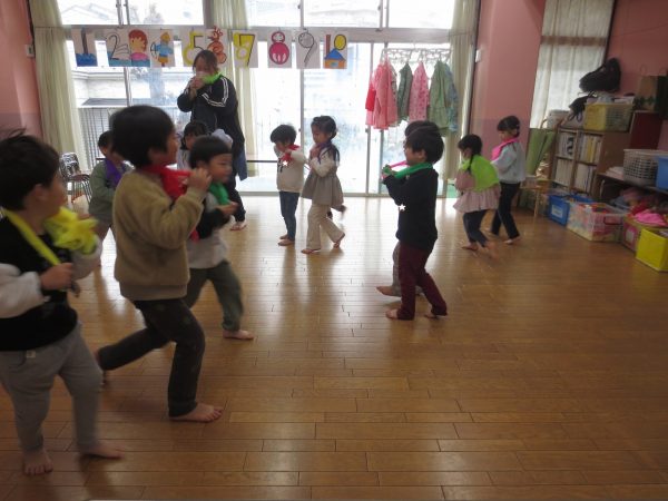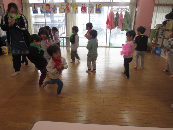 藤組さんは卒園式の練習をしています。カッコよく歩いて・カッコよく返事をして・カッコよくお辞儀をして・大きな声で歌って・大きな声でことばをいって・緊張することも大事な経験となる毎日です。