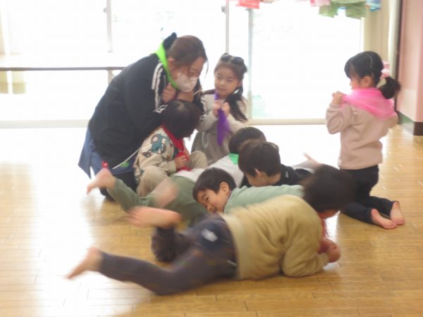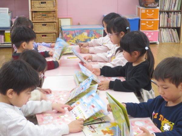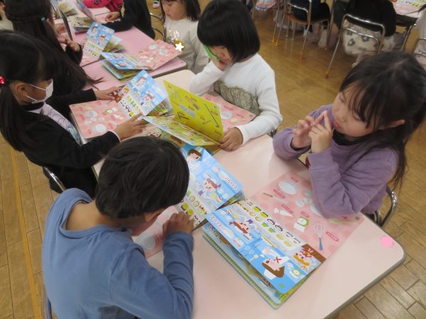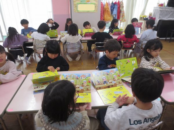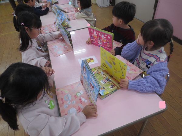 菊組さんは、リトミックをしたり、購読絵本の付録絵本「ごっこあそびえほん④ なりきりへんしんごっこ」を読みました。サッカー選手、トリマー、大工、パティシエ…ごっこ遊びは楽しいね💕